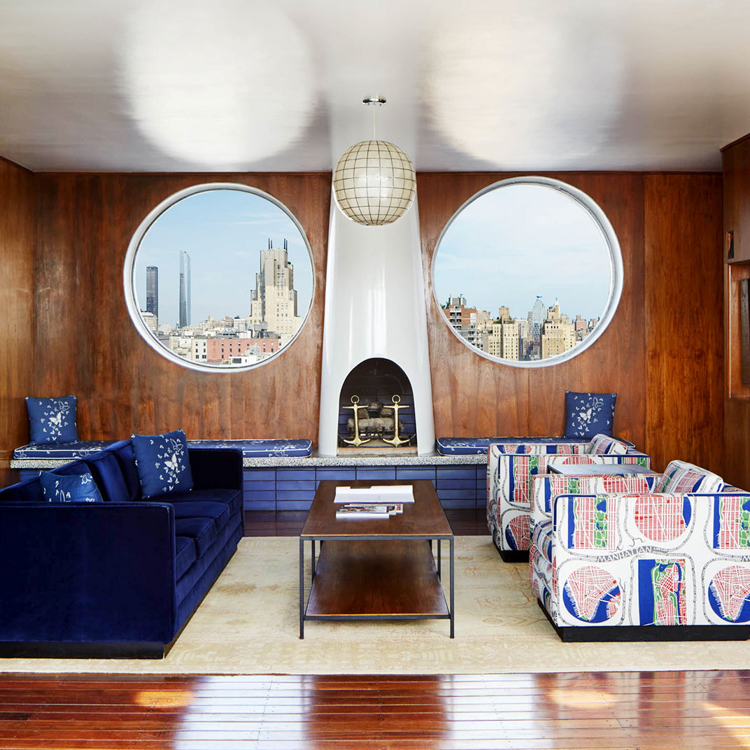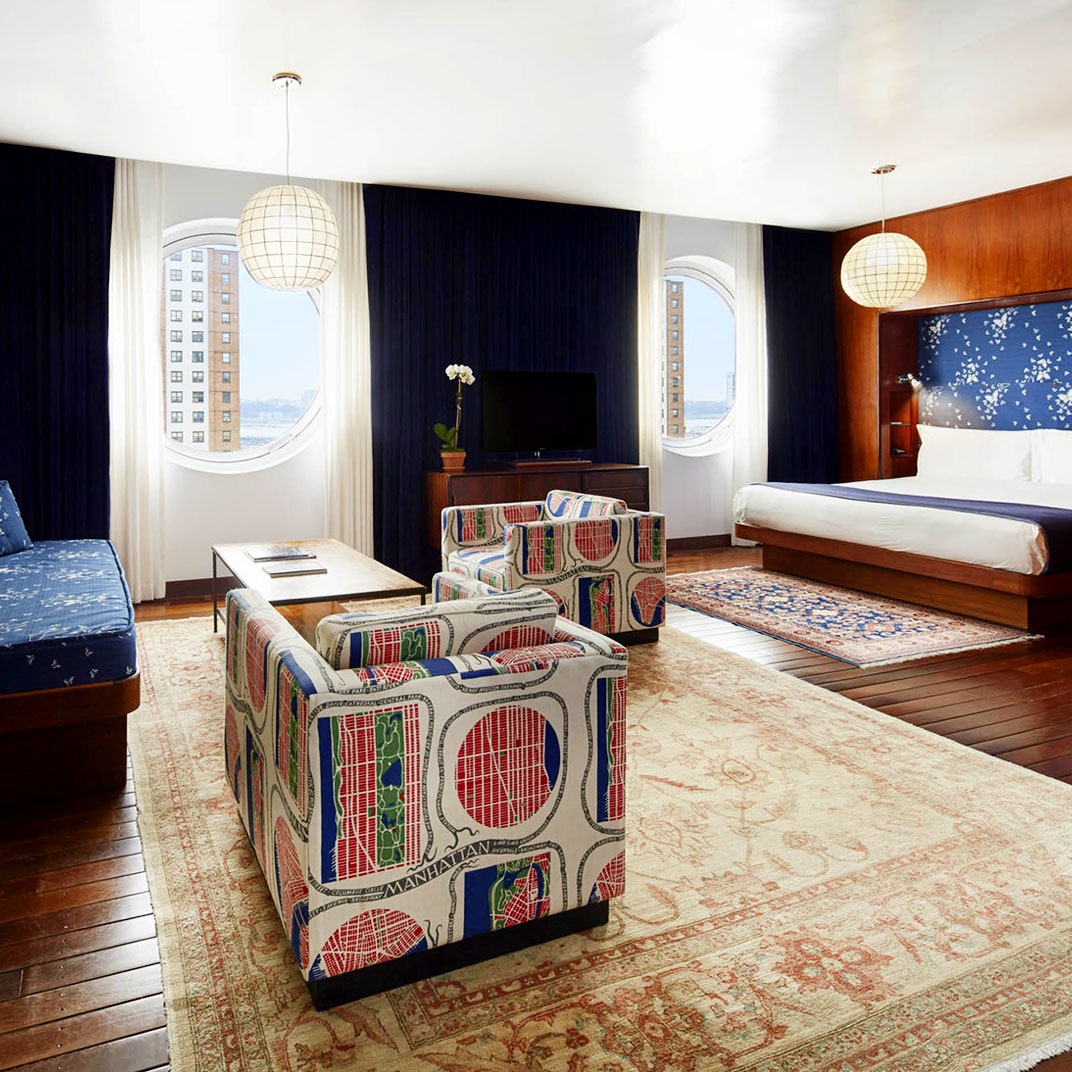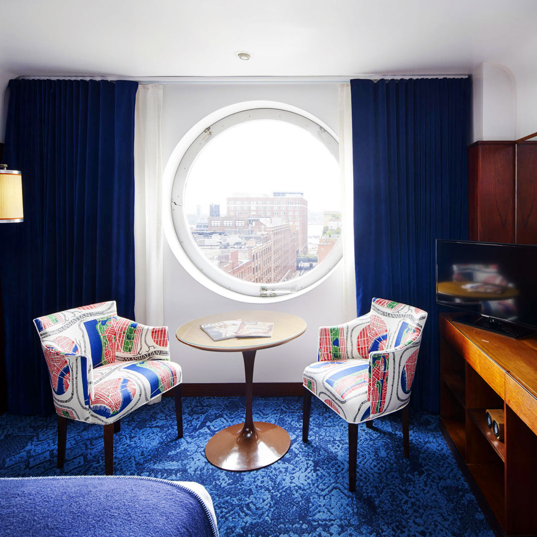 This is not a traditional hotel, by any stretch — all rooms face westward, looking over the Hudson and New Jersey through five-foot porthole windows. The rooms are compact, but well-designed, with built-in furniture, so that all the necessities (storage space, work desk, flat-screen TV) easily fit into the tiny space, and wireless internet, naturally, takes no space at all. The décor almost borders on kitsch, but is actually quite charming, if one accepts the ship's cabin conceit in all its wood-paneled glory.