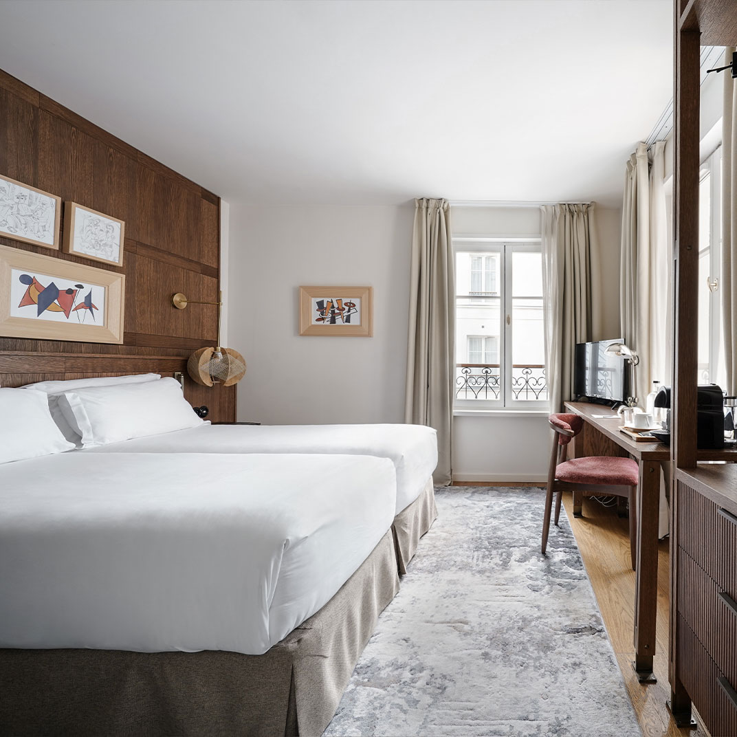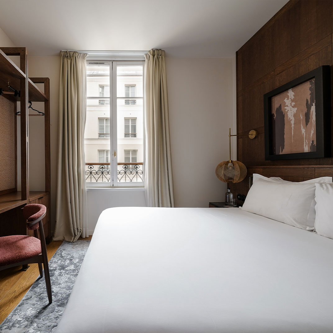 If you know its sister hotel in Barcelona, then you’ll know what to expect from the Hotel Pulitzer Paris: a sharp-looking blend of early 20th-century glamour and contemporary boutique hotel design, at a scale that allows it to be both lively and intimate without erring too far in either direction. The location, in the Opéra district of the 9th arrondissement, places it within easy reach of much of the best of Paris. And while a Spanish hotel group might not be the obvious choice for your Parisian boutique-hotel needs, a slightly different perspective affords the Pulitzer group a unique point of view.