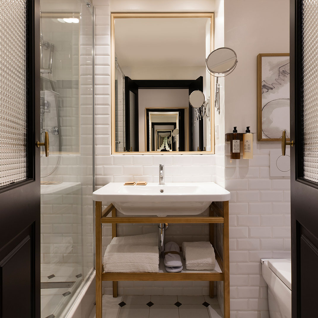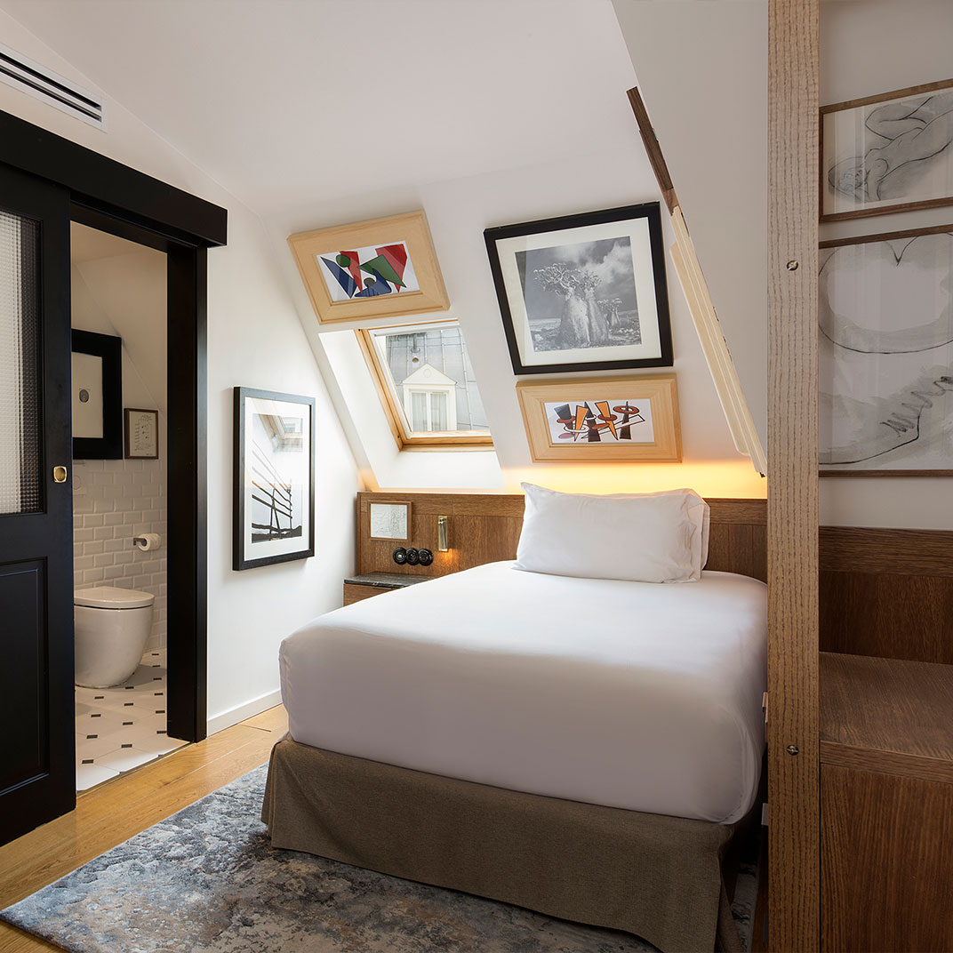 The rooms, in typical Parisian style, are an exercise in making the most of their limited space; the “Petite Mansarde” rooms, up under the eaves, are not just compact but genuinely cozy, and clever custom furniture and built-in storage makes all of the rooms eminently usable. The style is chic, and feels both classic and unexpected, which is all you can really ask of a big-city boutique hotel. And while a proper restaurant is by no means the norm in Parisian hotels of this size, the Pulitzer has plenty of convivial common space: a breakfast room, a cozy lobby bar, and the Patio, featuring cocktails and tapas in a stylish garden-like space.