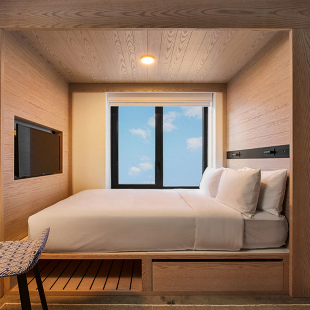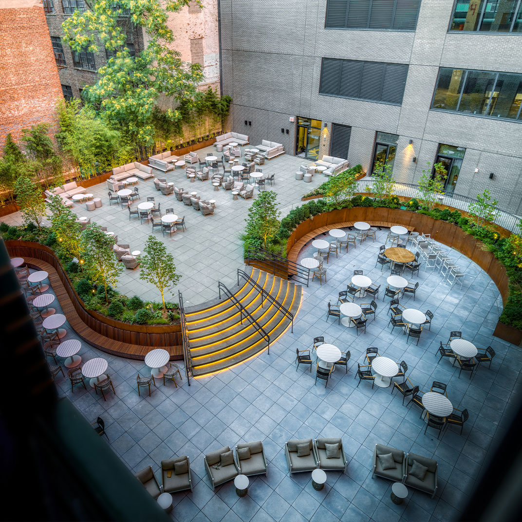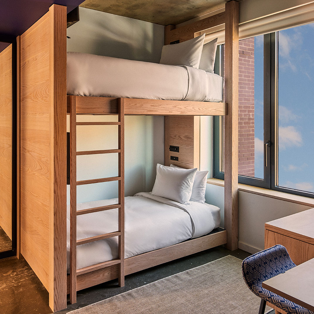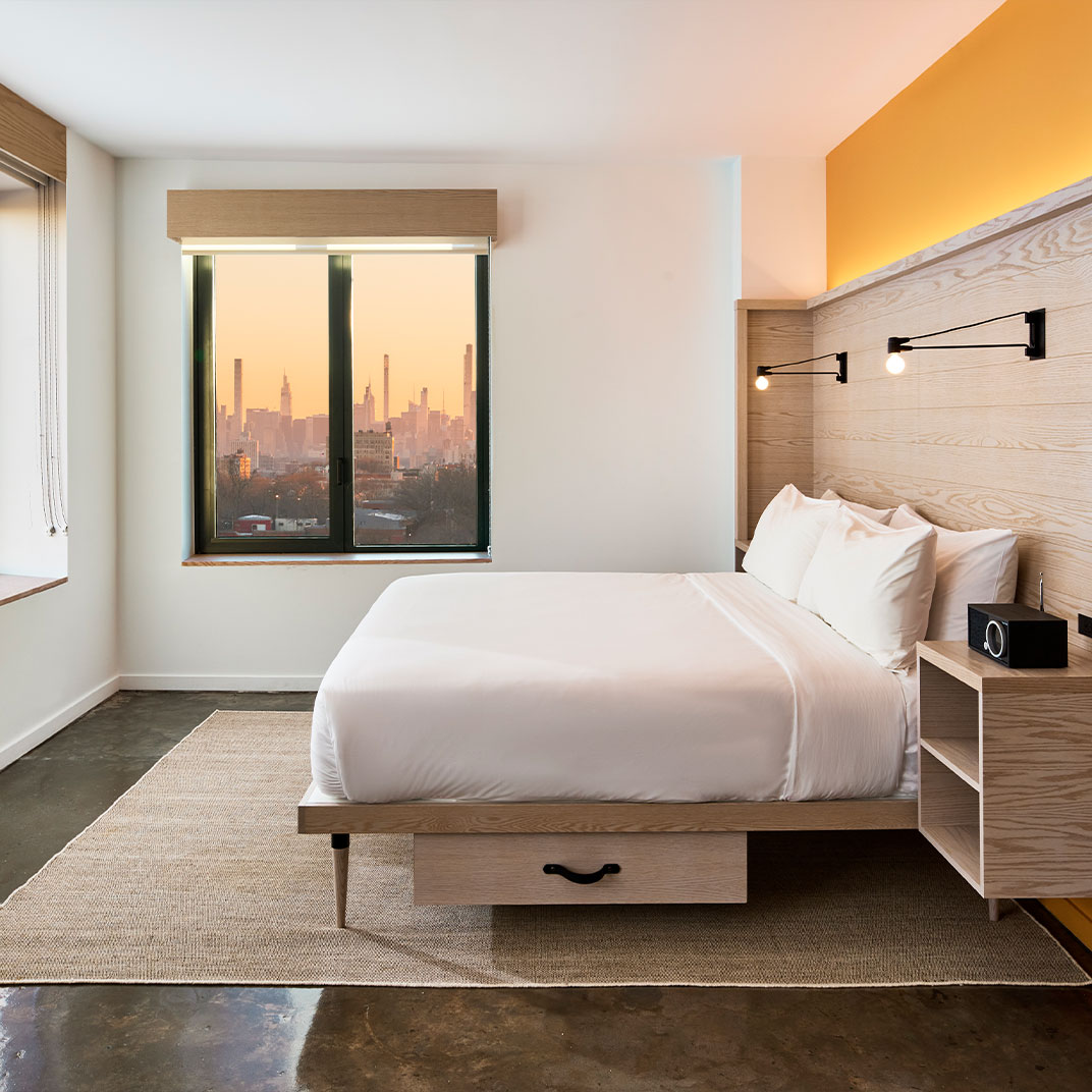 Radio’s rooms are a touch more sedate than its public spaces, the bedrooms minimalist but still handsome in neutrals and warm wood, setting up a stark contrast with the bathrooms, which are clad in ultra-saturated indigo-blue subway tiles. The spaces are highly efficient thanks to their modular modern furniture, and the views over this largely low-rise district are expansive. Downstairs, Jalao NYC serves Dominican-inspired flavors in a lively space, which opens onto El Patio, a courtyard space that’s tailor-made for summer nights.