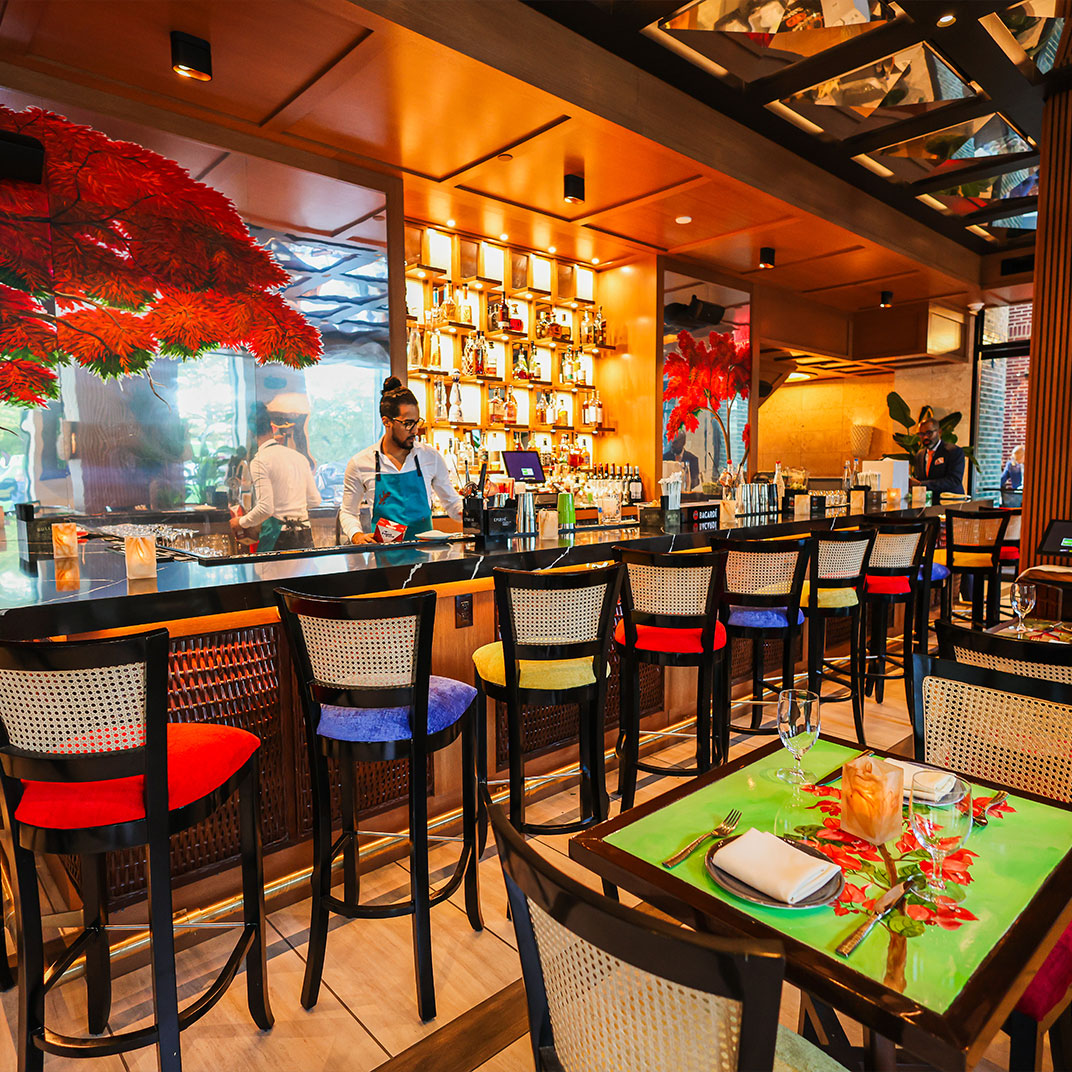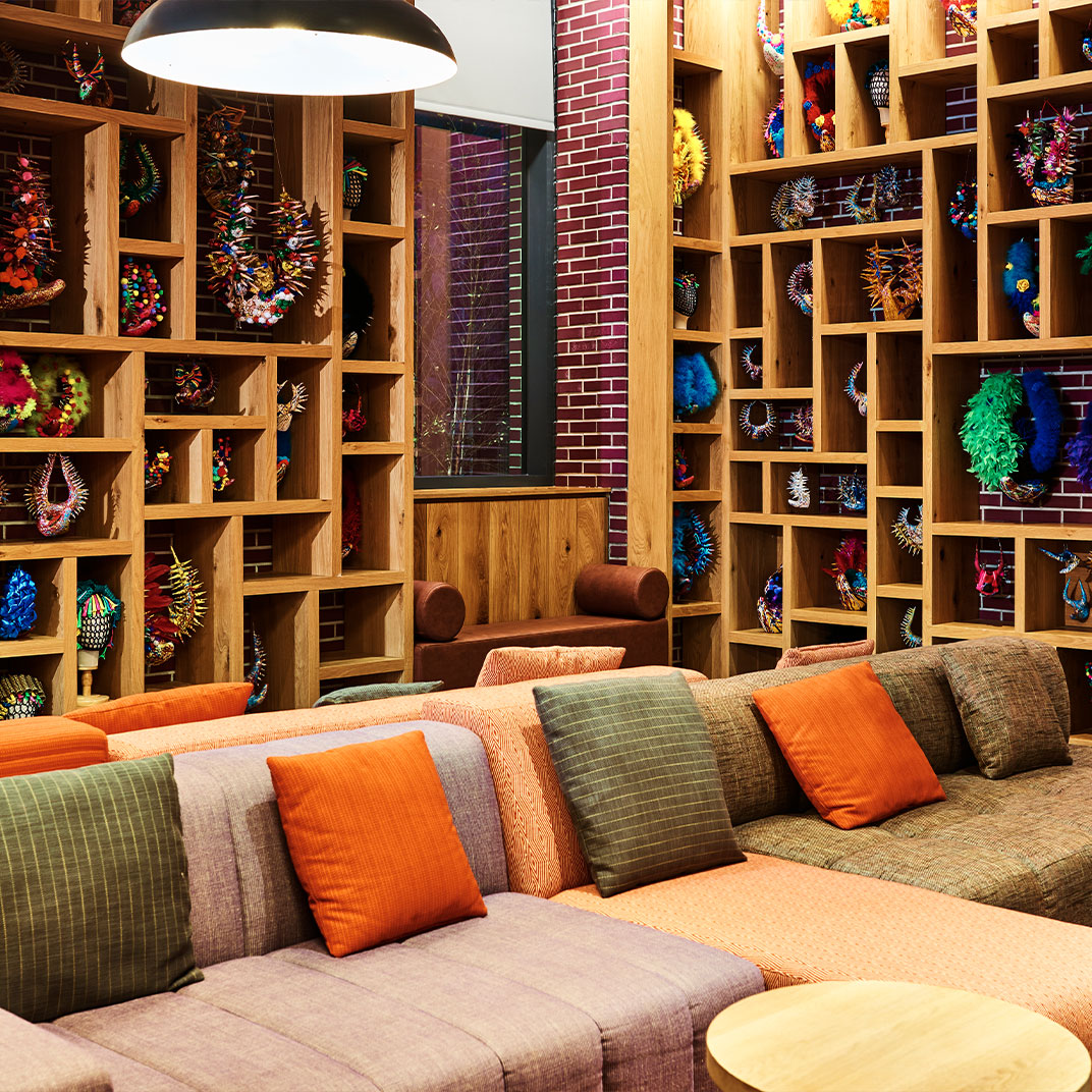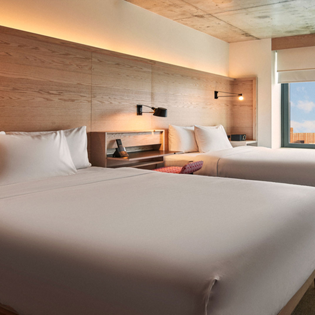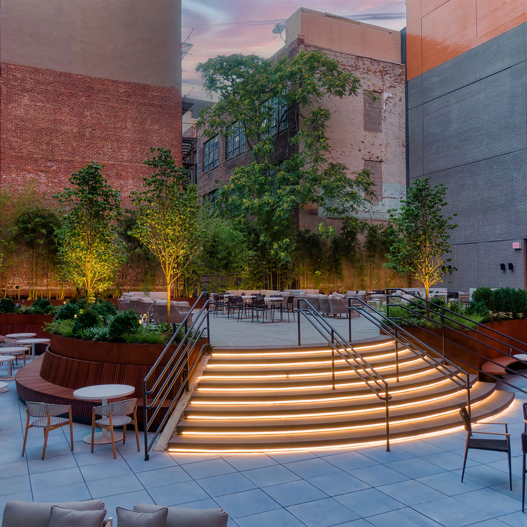Radio’s rooms are a touch more sedate than its public spaces, the bedrooms minimalist but still handsome in neutrals and warm wood, setting up a stark contrast with the bathrooms, which are clad in ultra-saturated indigo-blue subway tiles. The spaces are highly efficient thanks to their modular modern furniture, and the views over this largely low-rise district are expansive. Downstairs, Jalao NYC serves Dominican-inspired flavors in a lively space, which opens onto El Patio, a courtyard space that’s tailor-made for summer nights.