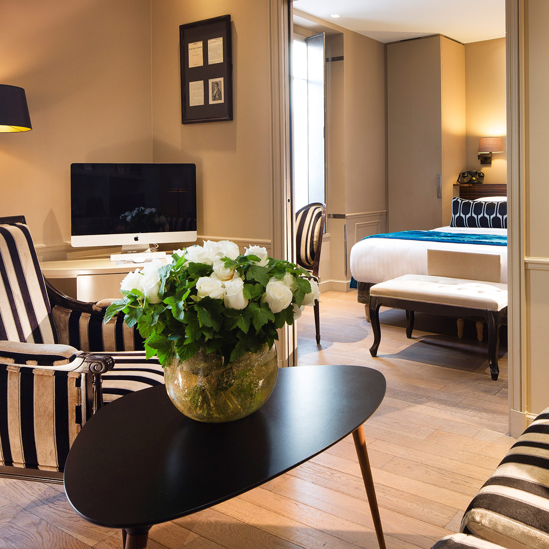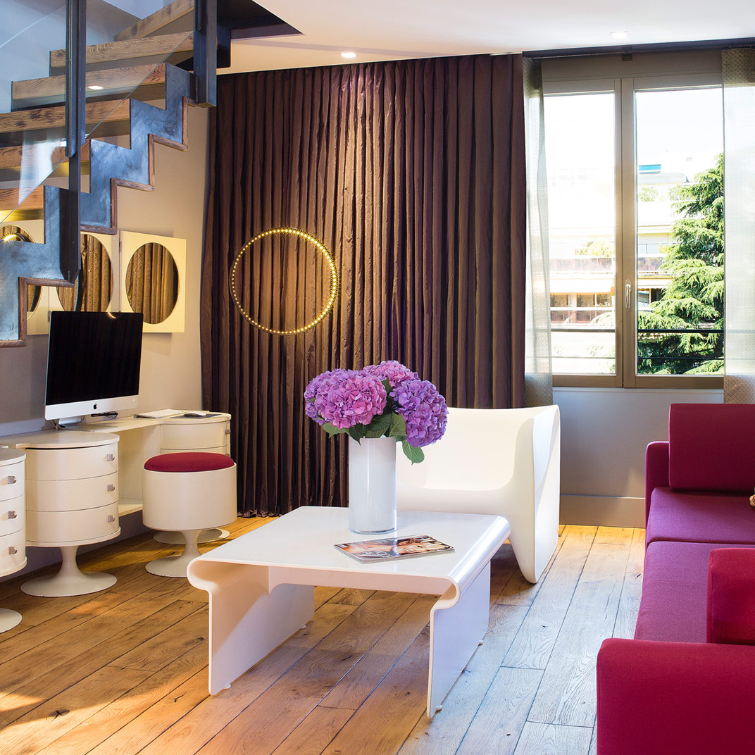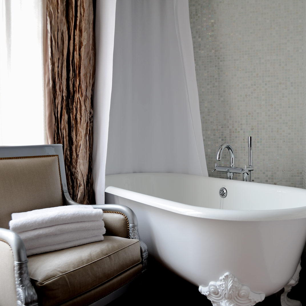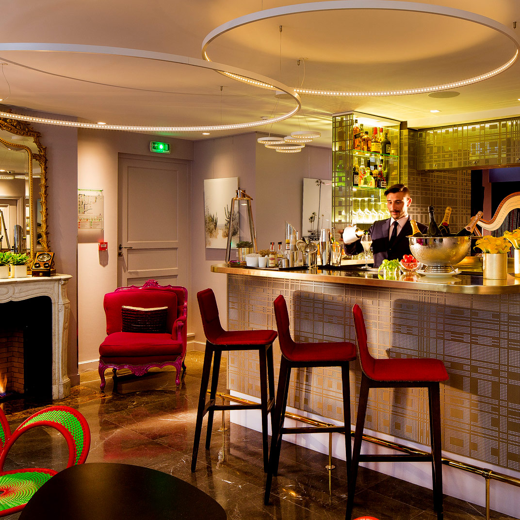 The ground floor features a multi-purpose bar and lounge space with a small-plate menu and a revamped selection of wines, champagnes, and cocktails. Do as the Parisians do and loll about with your poison of choice — or just stop by for an afternoon tea on the terrace. Better yet, take your tea in the spa, a remarkably lavish (and reservable) affair for such a small boutique hotel.
