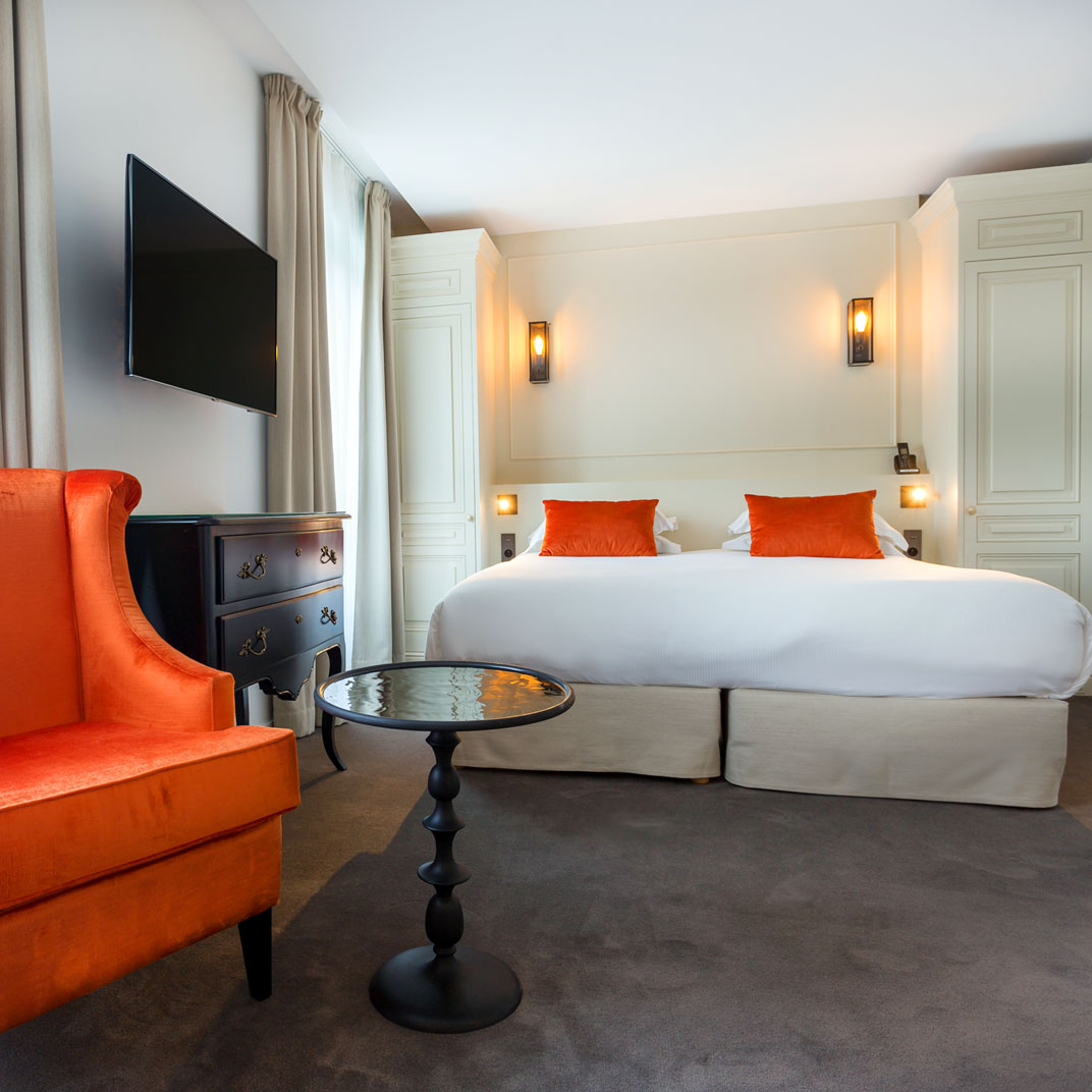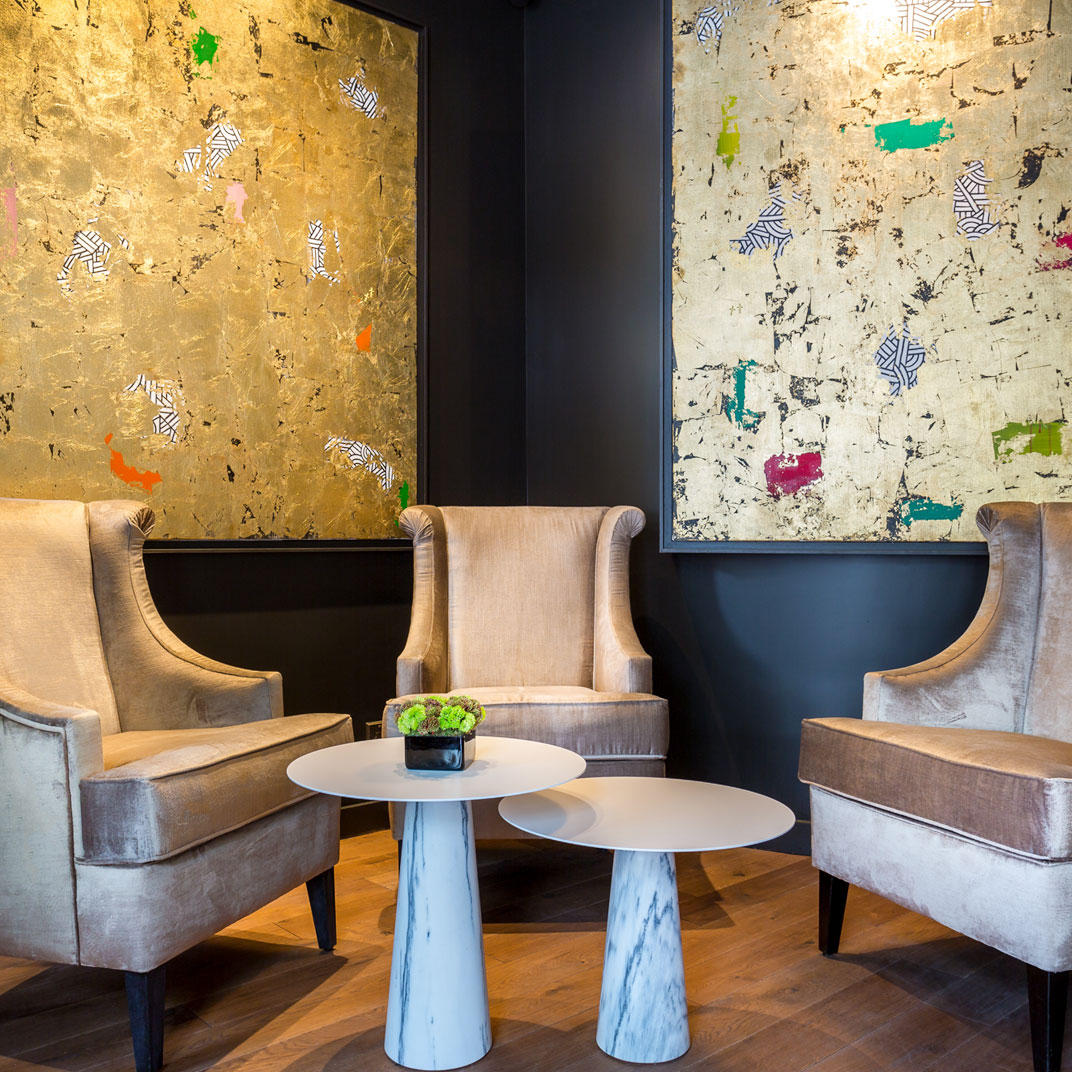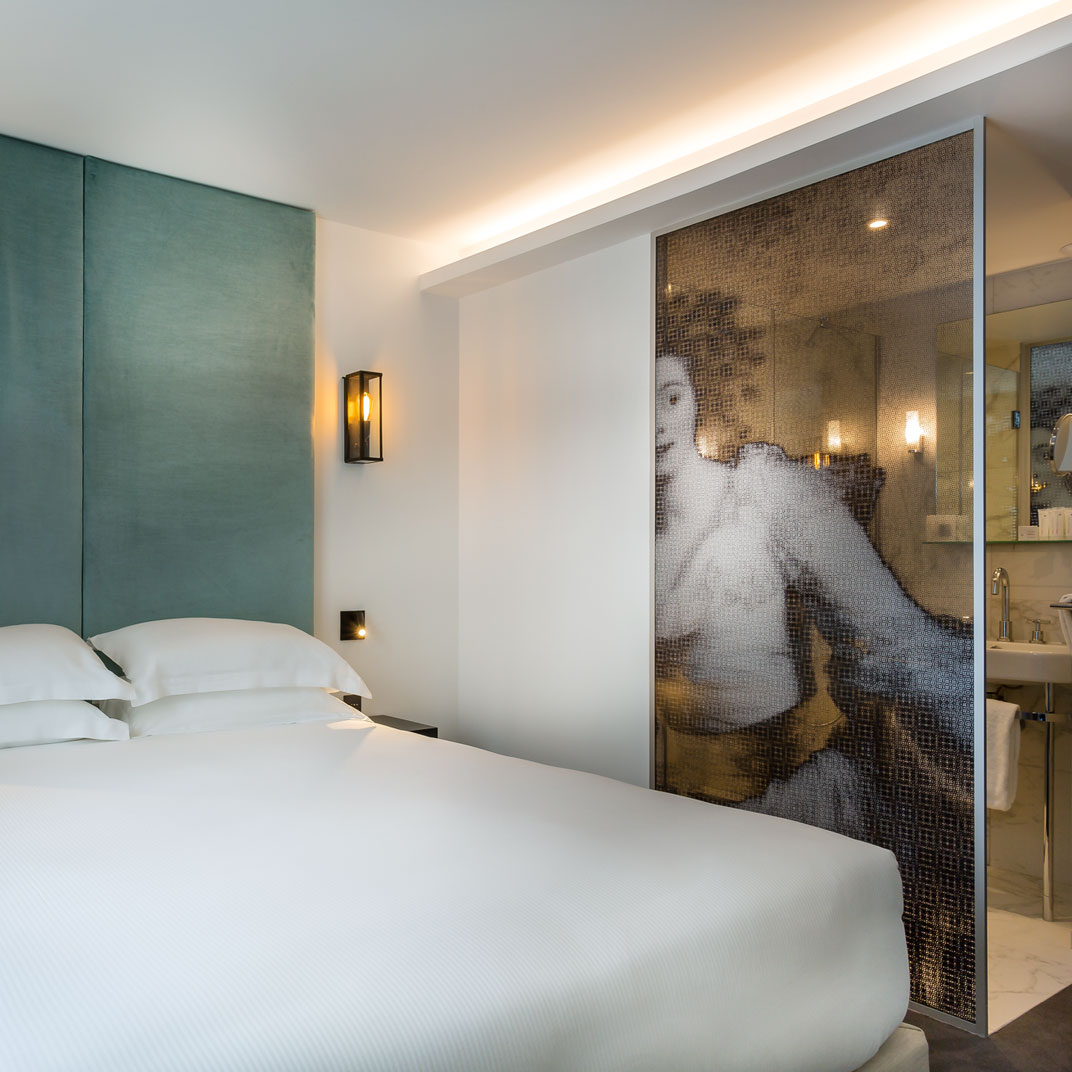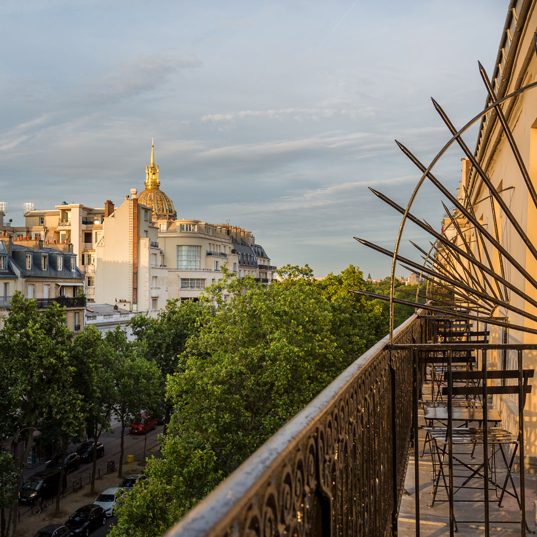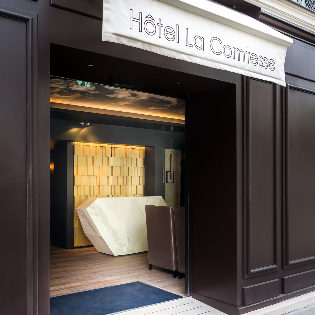 And if what you want is to sit on a tiny balcony, sipping Chenin blanc while gazing out at a postcard-like view of an iconic symbol of France, Hotel La Comtesse has got you covered. These rooms and suites aren’t huge: this is the Left Bank, after all, the beating heart of the seventh arrondissement. But they have everything you need, with elegant but understated décor, flat-screen TVs, free wi-fi, and, of course, picture windows or private balconies facing the Eiffel Tower. The look mixes the romance of 18th-century literary salons with a crisp, modern aesthetic. Downstairs, striking public spaces feature the historic buiding’s original moulding, but painted blood-red, floor-to-ceiling bookshelves stocked with art and design books, a ceiling fresco offset by rich blacks, metallic hues, and dramatic lighting.