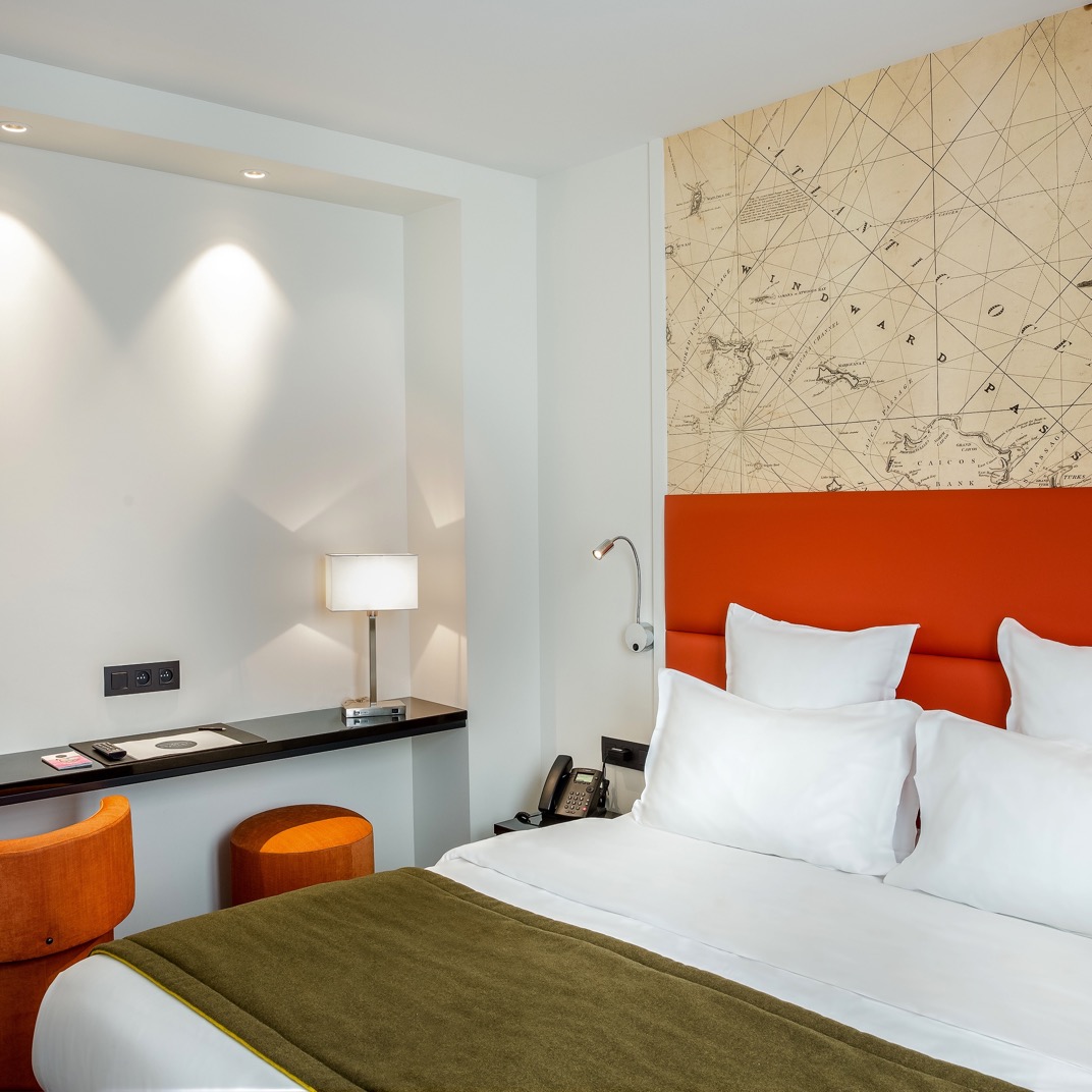 Guest rooms are petite and light-filled, retaining the building’s original floor-to-ceiling windows and featuring amenities from flat-screen TVs to fully stocked minibars to handy workspaces. The continental breakfast is a simple but elegant affair, with its array of organic fruit juices, home-baked breads and exotic fruit jams. You can get a drink here, too — it’s Paris, after all — but Hotel Scarlett isn’t a place to hang around all evening. The whole point is to get out, of course. The hotel staff has set up their system accordingly, conveniently programming the in-room phones to connect guests directly to a curated list of their favorite neighborhood venues — whether you want to squeeze in a workout, buy a painting, or grab aperitifs with the Belleville crowd, Hotel Scarlett has you covered. La Vie en rose, indeed — just a slightly different version of it than you’ll see in the heart of Paris.
