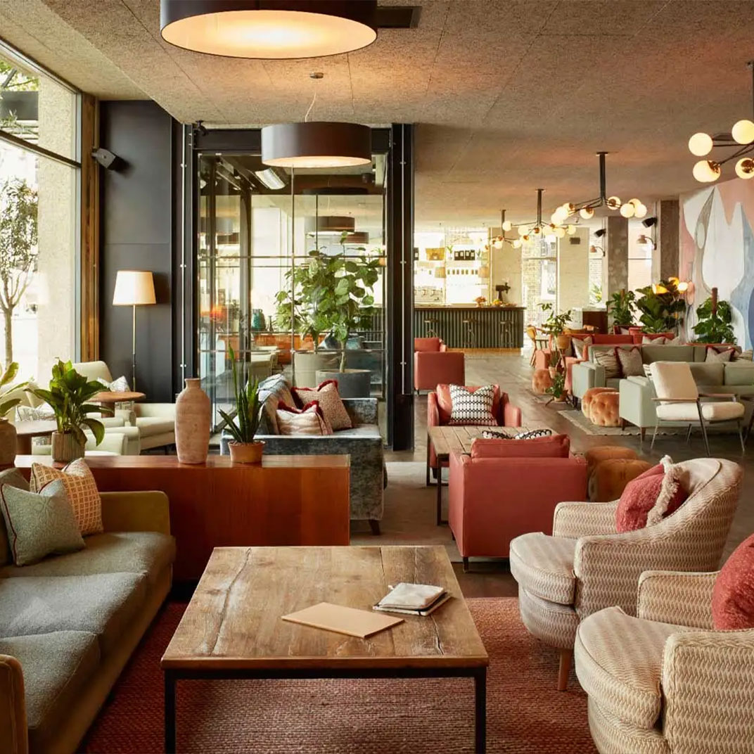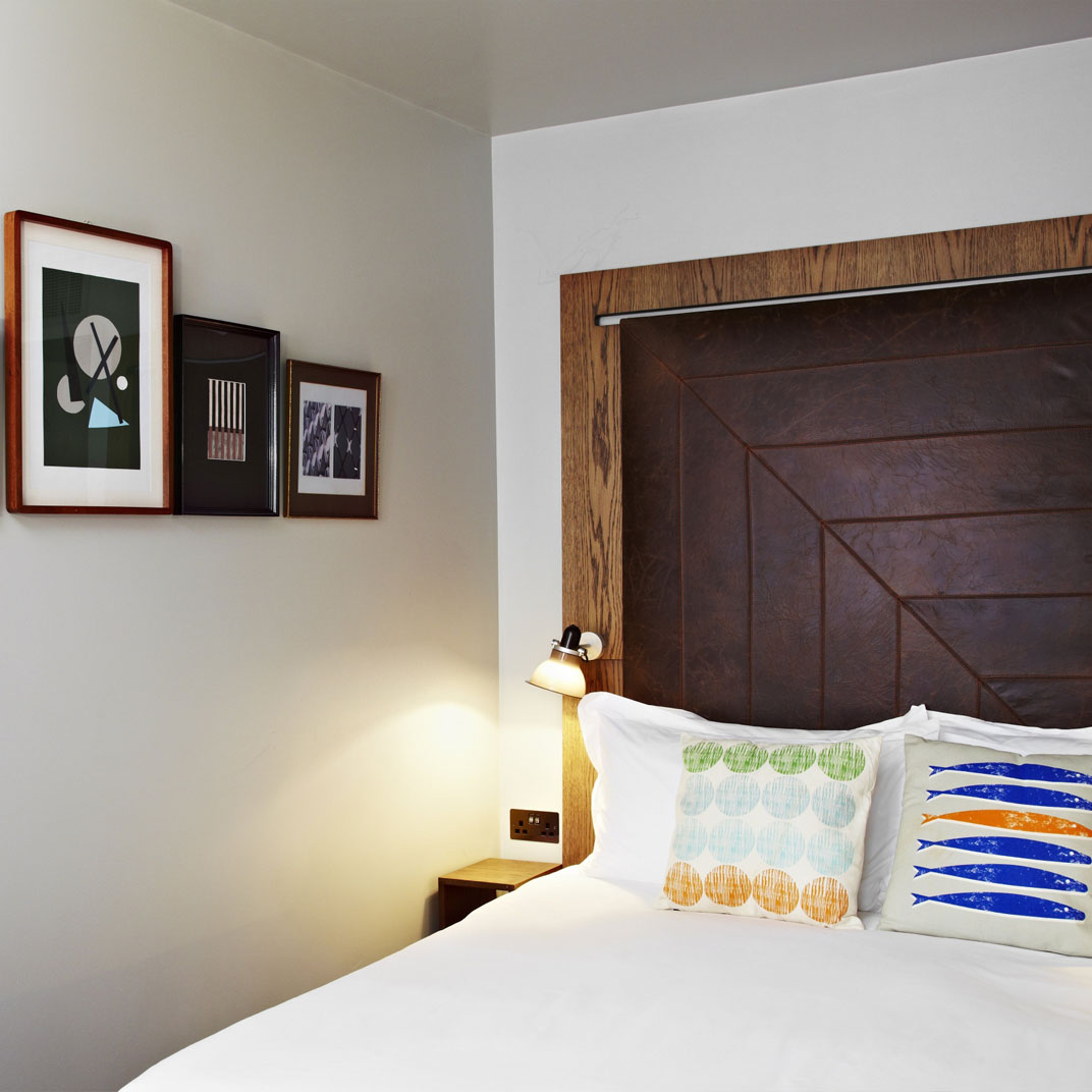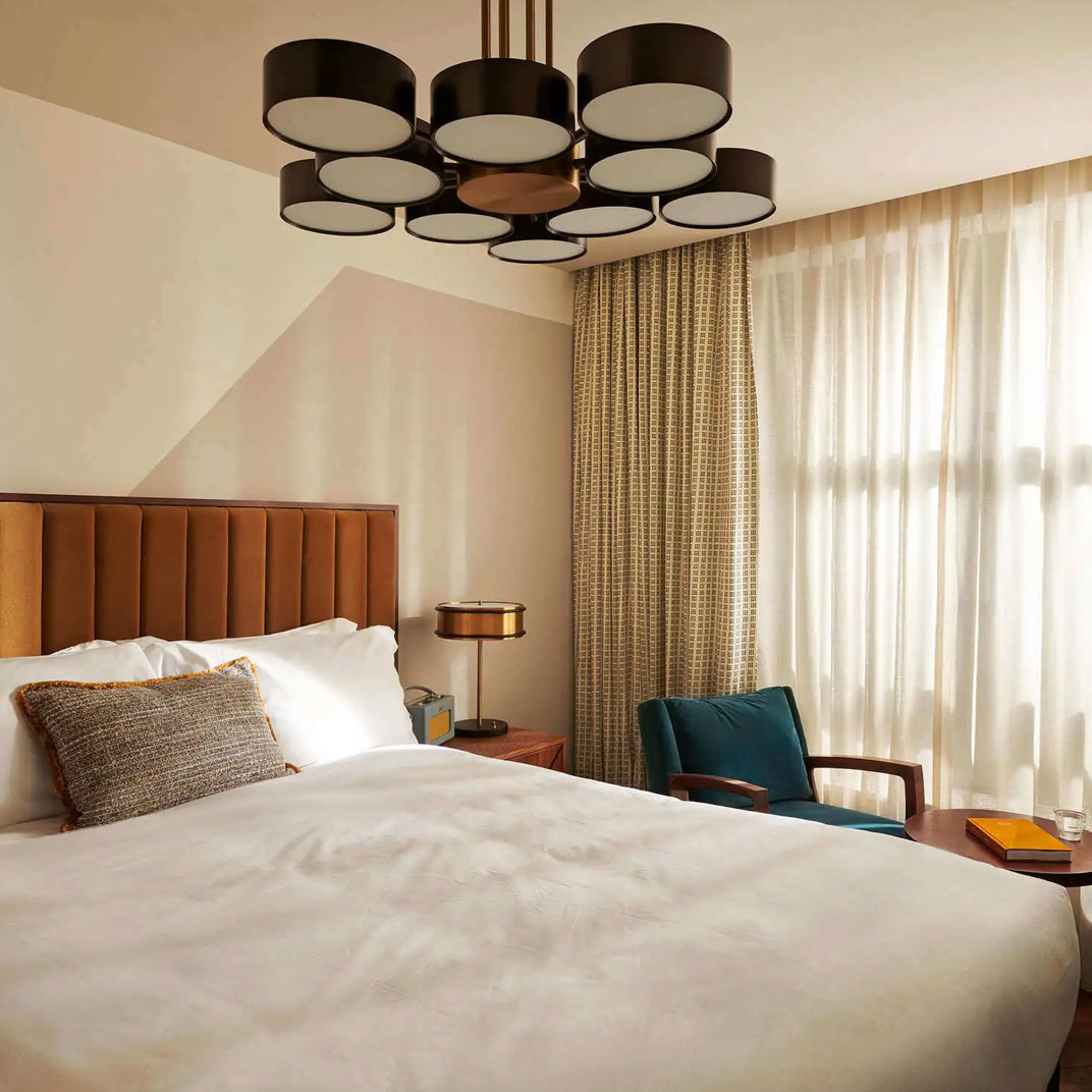 The look, as in all the Hoxton hotels, is eclectic and a bit rough-edged, with industrial patina and late-modernist retro colliding in inspiring ways. The rooms don’t mince words; they range from Shoebox and Snug sizes all the way up to Roomy and even Biggy, and at all levels they’re comfortable without being ostentatious, furnished with handmade mattresses, rainfall showers, USB outlets, and mini-fridges stocked with water and milk (and more staples available at reception for supermarket, rather than minibar, prices).