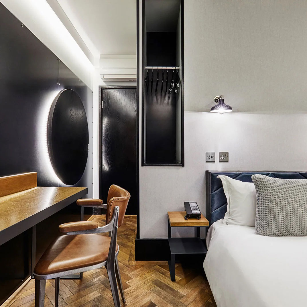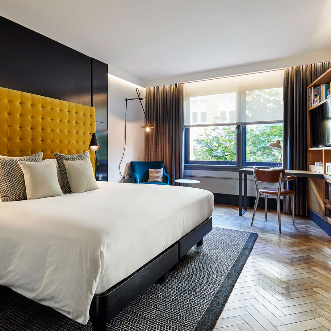 It helps that the public spaces are so inviting. The Hoxton Grill is inspired by American diners, but with its leather banquettes and armchairs it’s a good deal swankier — and it’s open from early morning through late night, for meals, coffee, a bit of work, or a drink. And there’s plenty to do and see just outside the hotel’s doors — this corner of London is where the action is, and the Hoxton is perfectly placed to show you the way.