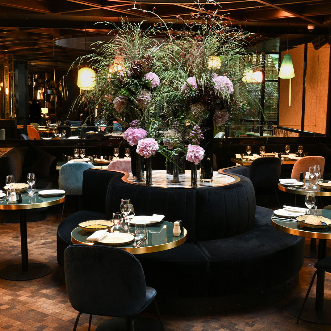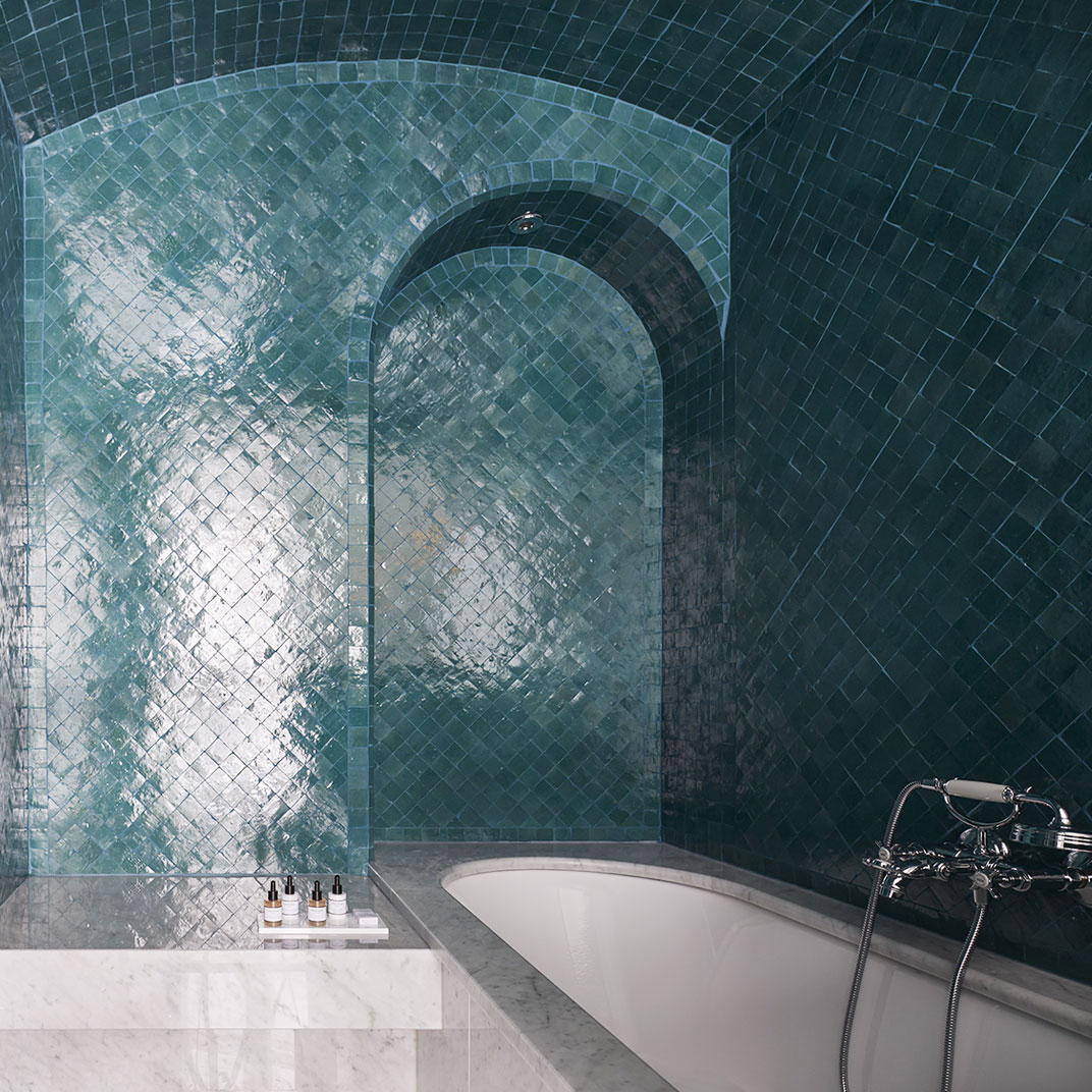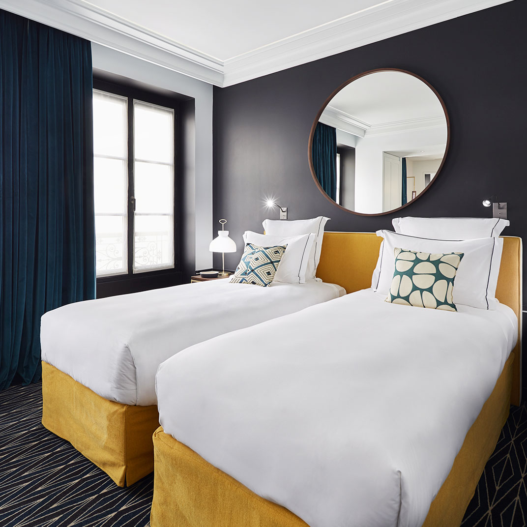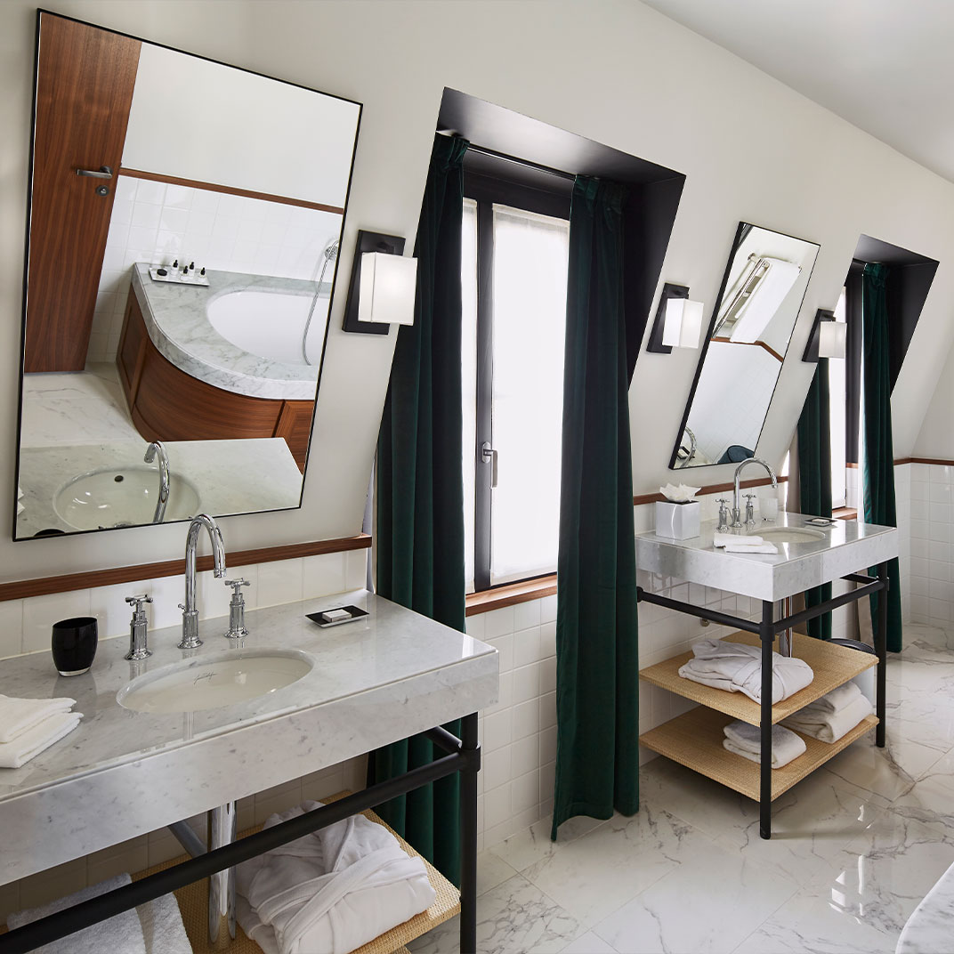 Forget minimalist lines and all-white interiors: thanks to large windows everywhere, Le Roch is filled with natural light, but Lavoine’s aesthetic is dark and sumptuous, exuding old-world glamour with a modern edge. Think chocolate, black, and navy blue, Carrera marble and walnut flooring, sculptural lamps and large round mirrors, patterned rugs and velvet sofas you’ll be glad to sink into after an afternoon walking around the city. That’s the idea here — a home away from home, with better sheets and pain au chocolat on the breakfast table.