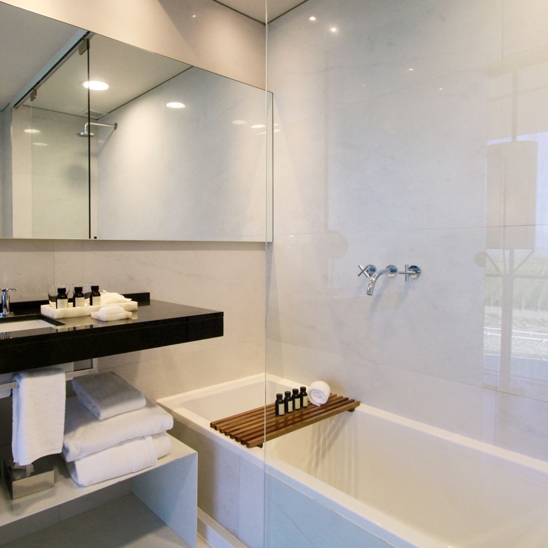 There’s a fairly staggering number of room categories and styles. Break it down into three major groups: standard rooms, outfitted in blonde wood, crisp white and charcoal, with Egyptian cotton linens atop king-sized beds, ultra-modern glass-encased showers, large smart TVs, and daybeds set in the deep curve of picture windows facing the mountains. On the next level up, suites have the wow factor, with private terraces that seem to float over the lake below; some also feature large living rooms and extras like deep soaking tubs.