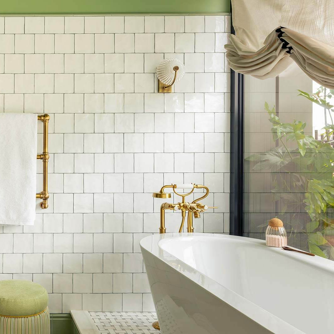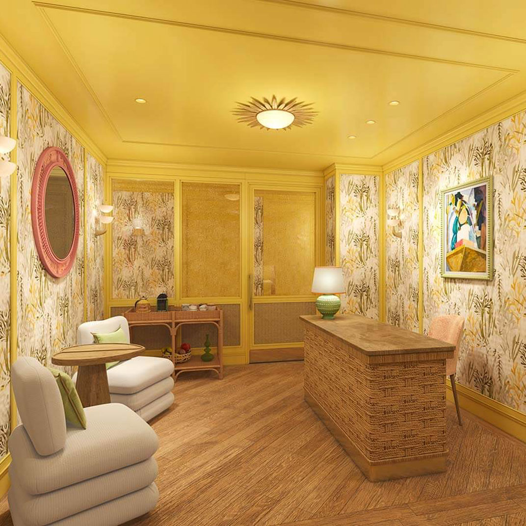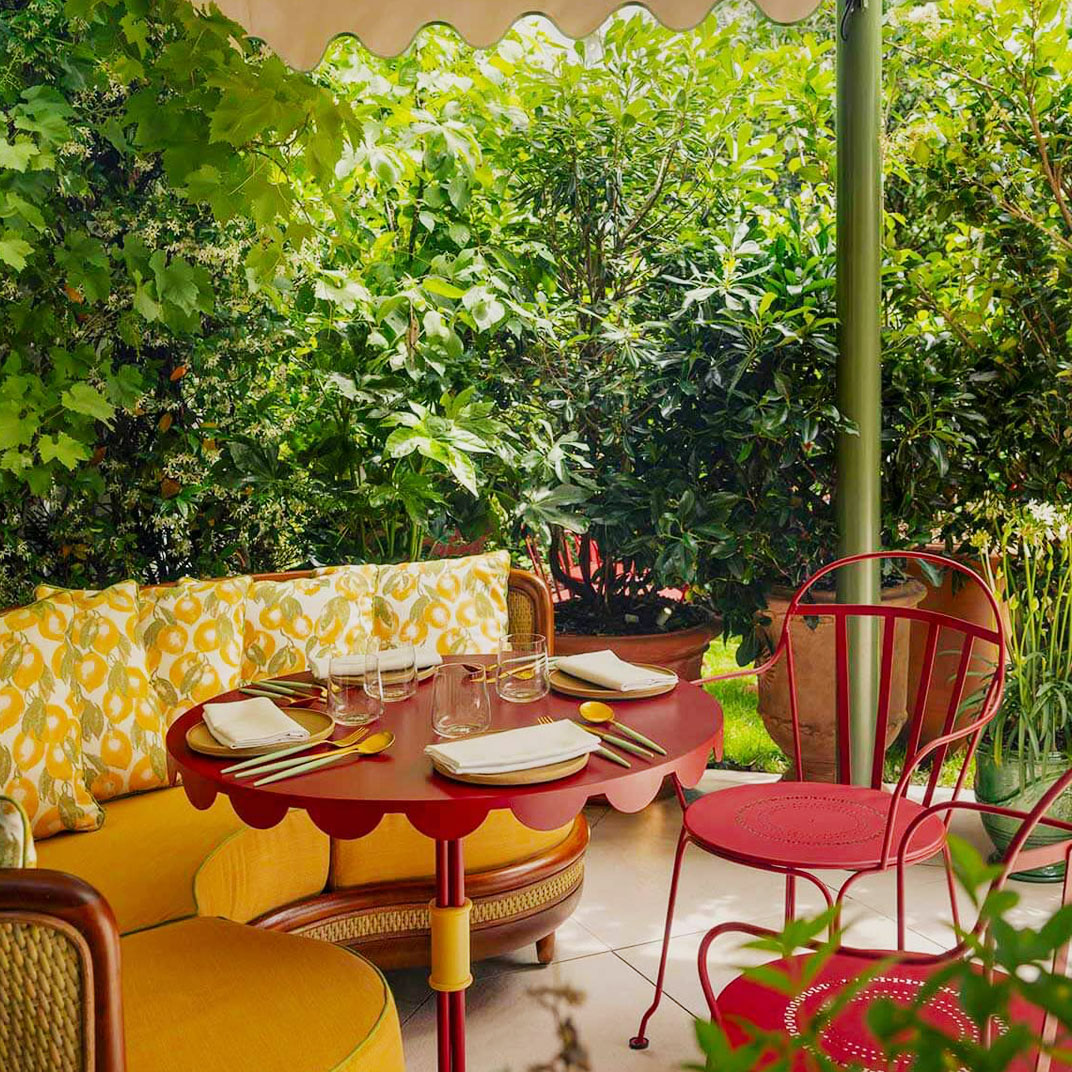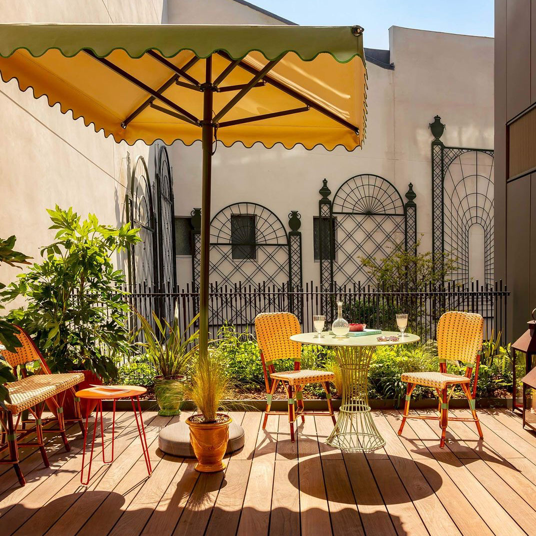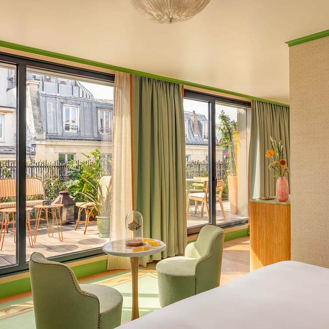 Brudnizki imagined the hotel’s layout unfurling upward like a flower, from seedlings in the subterranean spa, where botanical mosaic murals surround pale green-tiled mineral pools, all the way up to the rooftop. The bloom of the flower, so to speak, is a stunner, with dazzling views of Paris, plush vintage sofas, and romantic café tables tucked away amid a lush thicket of trees and plants. In comparison to the whimsical common spaces, La Fantaisie’s rooms and suites are more restrained, but the look is still bright and cheerful: floral wallpaper and art prints, mid-century modern furnishings upholstered in vibrant shades of orange and turquoise, and marble bathrooms finished with retro Parisian details. Suites have private wooden decks with parasol umbrellas and live greenery, some facing the interior garden and others offering postcard-like views of the neighborhood’s quaint rooftops.