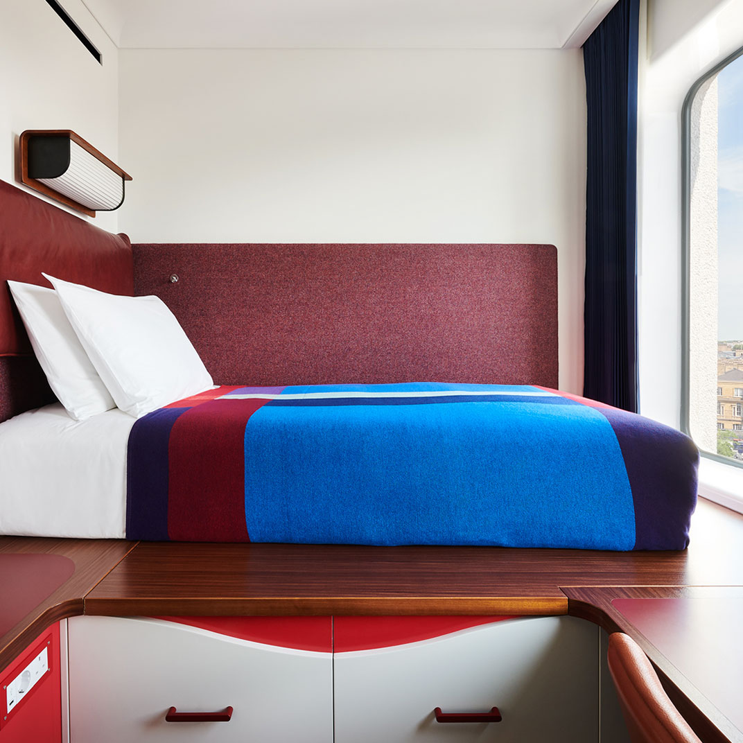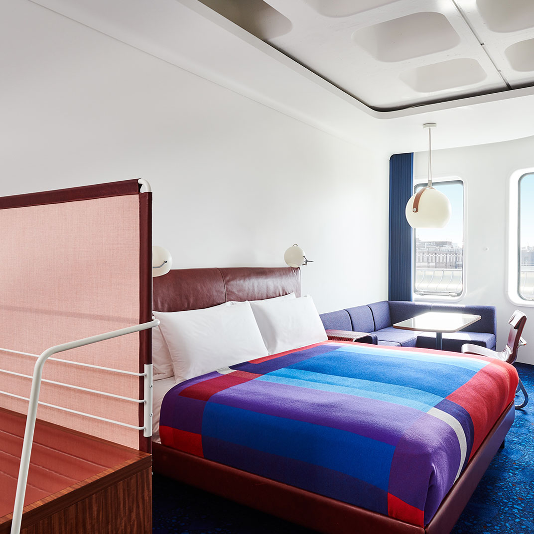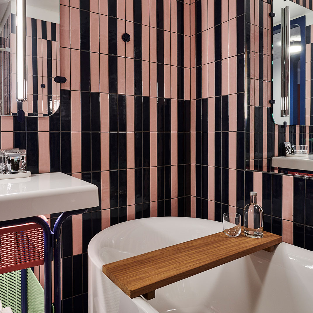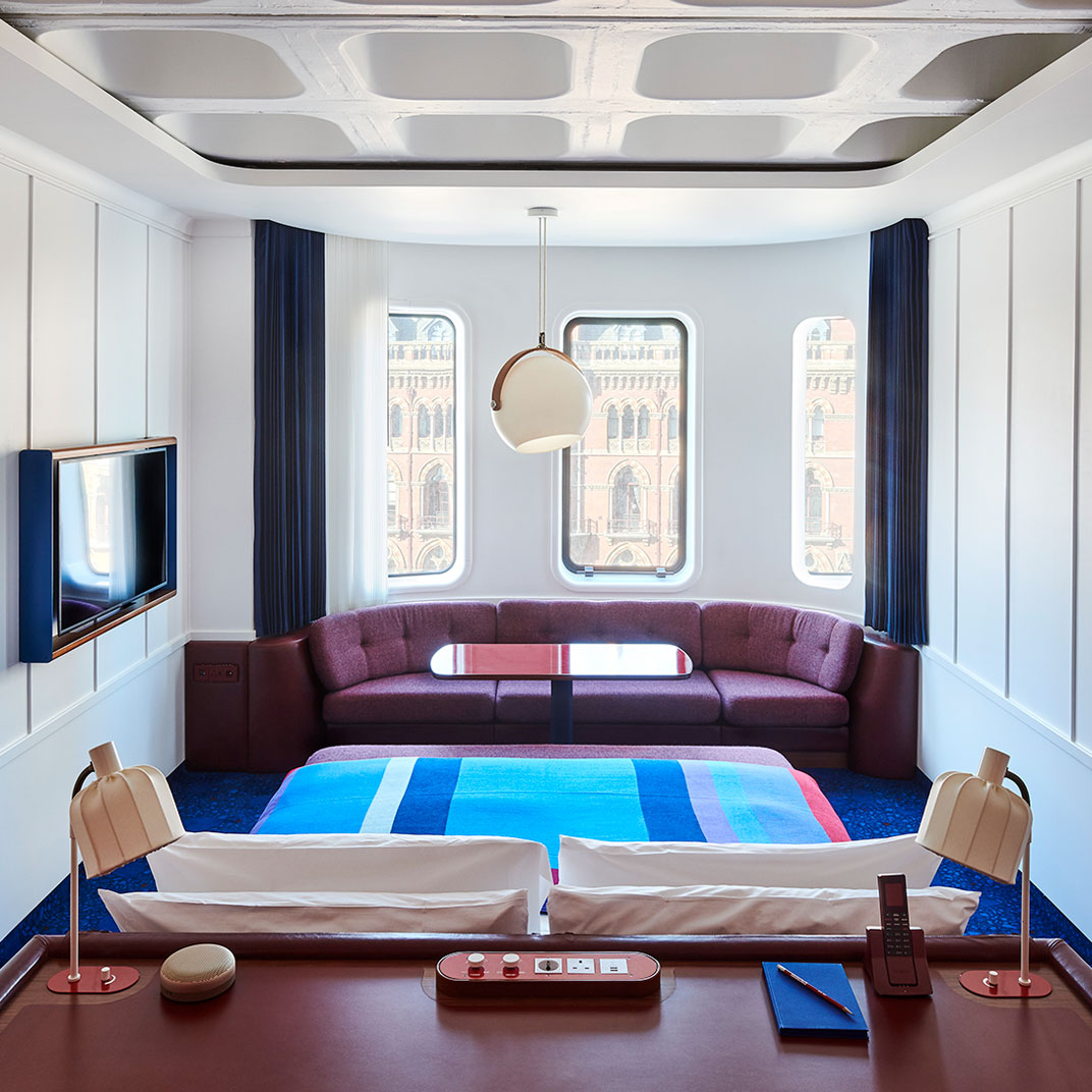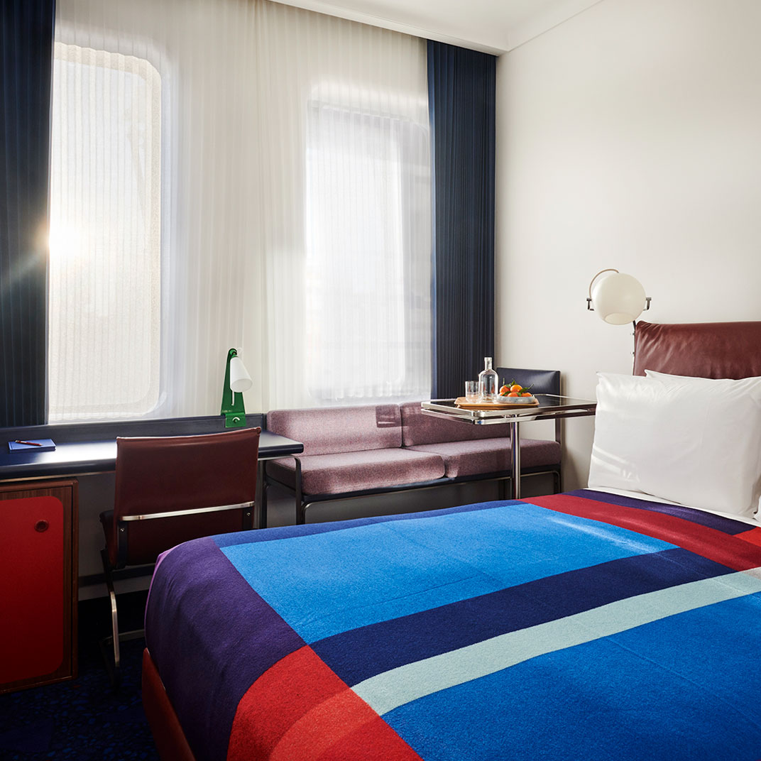 The colorful interiors provide maximum contrast with the monochrome façade, and they’re notable for their period inspiration, if not their historical correctness — with their space-age lines and their saturated secondary colors they’re an homage to the utopian currents of Seventies modernism. The rooms are instantly memorable, recalling a familiar era but avoiding all the mid-century clichés. And at the high end you’ll find unexpected luxuries, like private terraces with outdoor bathtubs.