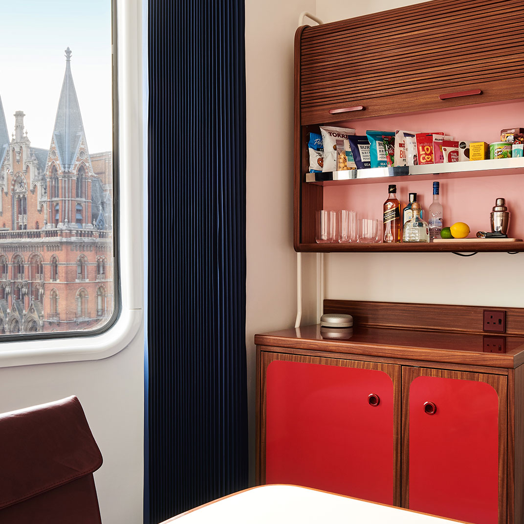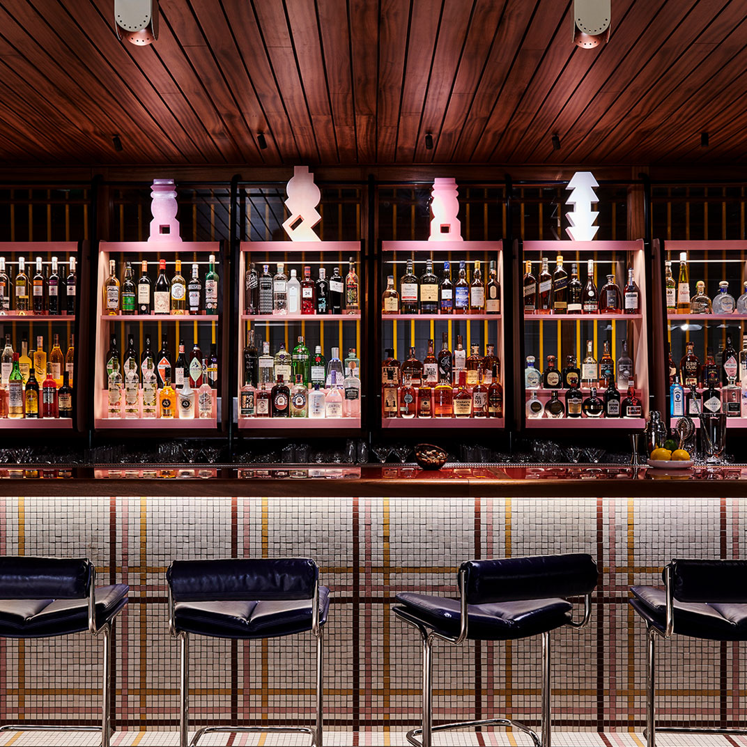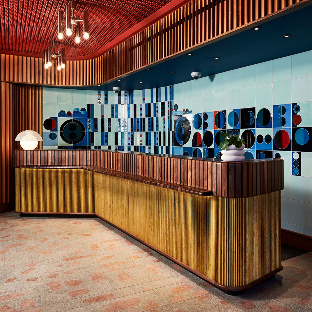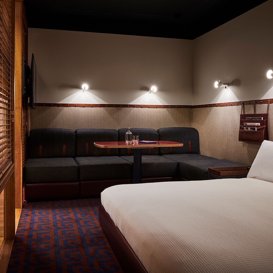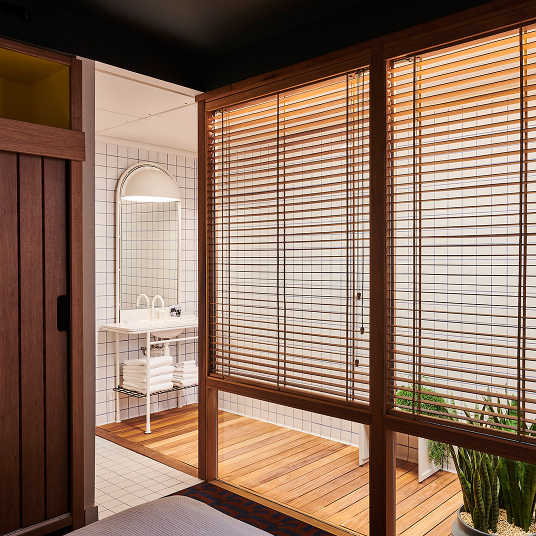 The colorful interiors provide maximum contrast with the monochrome façade, and they’re notable for their period inspiration, if not their historical correctness — with their space-age lines and their saturated secondary colors they’re an homage to the utopian currents of Seventies modernism. The rooms are instantly memorable, recalling a familiar era but avoiding all the mid-century clichés. And at the high end you’ll find unexpected luxuries, like private terraces with outdoor bathtubs.