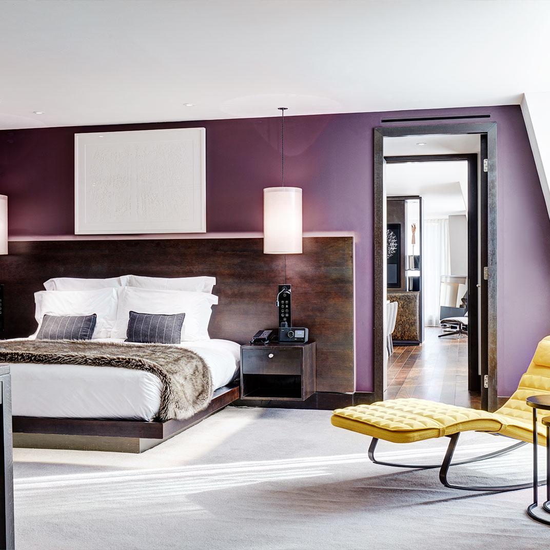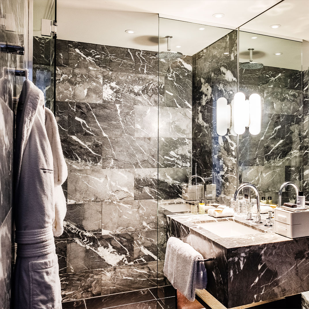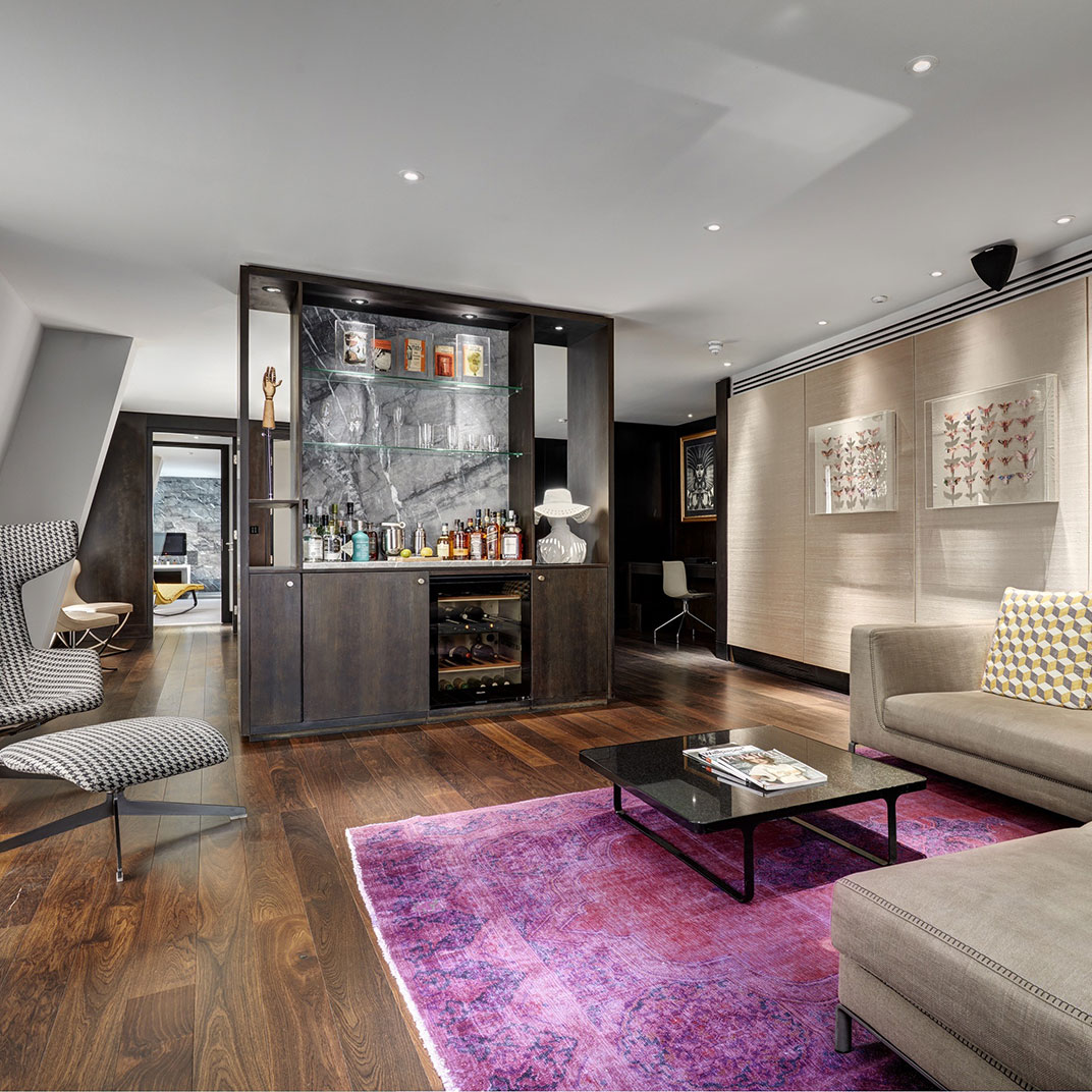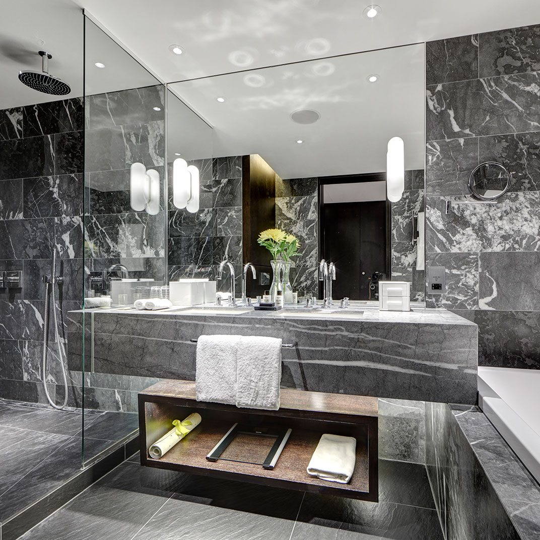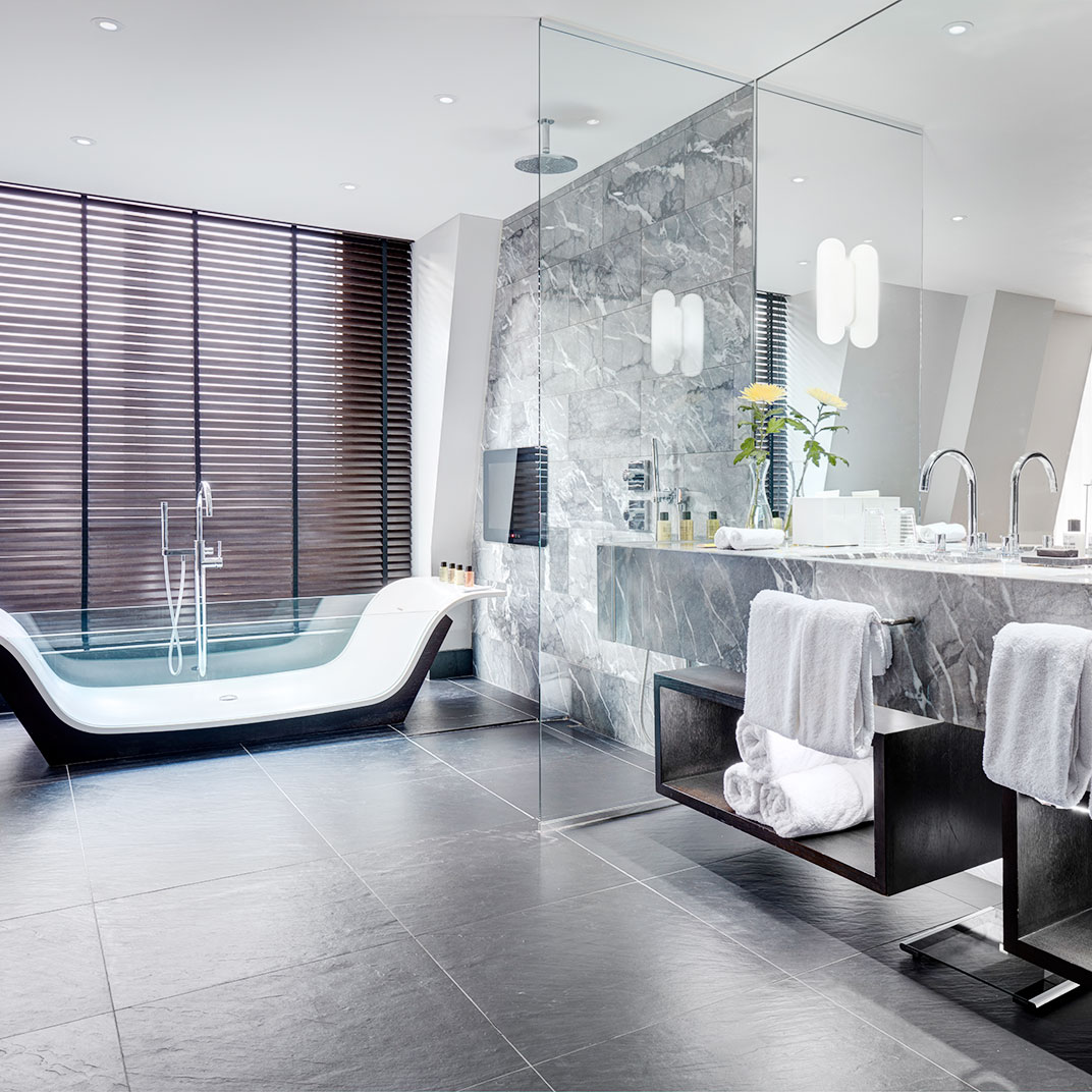 Fortunately, it’s as easy to get a good night’s sleep here as it is to get an expertly crafted drink. The rooms are designed by Conran, who also did the celebrated new Boundary Hotel nearby, and it’s clear who had the power in the relationship between the accountants and the designers. Rooms run from spacious-by-London-standards to positively enormous, with beds, which start out king-size and only get bigger, to match. Lavish Italian-marble bathrooms are stocked with toiletries by the perfumer James Heeley; oversized showers fit two or three bathers at a time; massive Bang & Olufsen screens come with free on-demand movies; and luxurious bedding, including mattresses wrapped in cashmere and silver (why not?), are by Josephine Home. Not that it’s all extravagance for the sake of extravagance. Take the highly functional, oversized work-desks, fitted with recessed media hubs and multinational sockets — perhaps less sexy than, say, the glass bathtub in the window of the Suite 610 room, but proof that function can coexist with form.