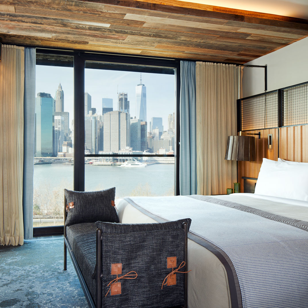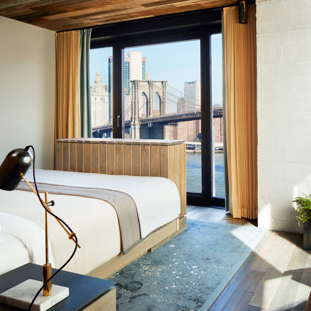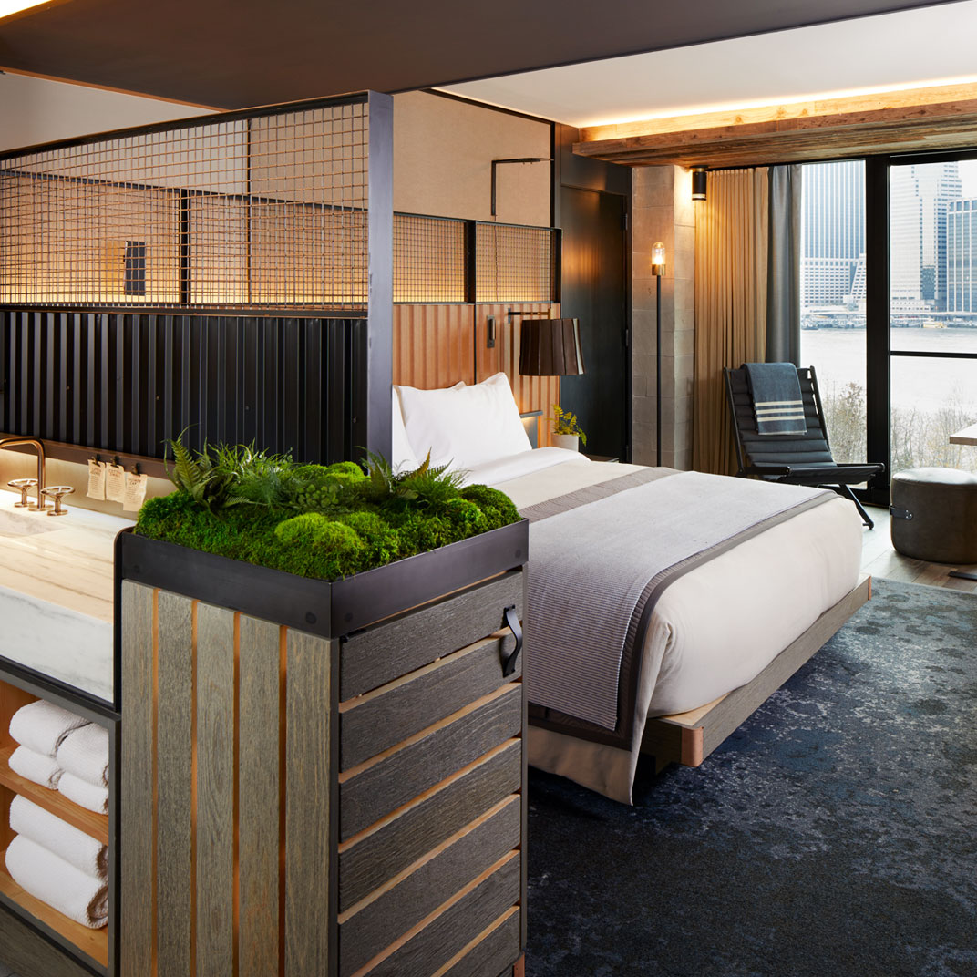 The Manhattan iteration of the 1 Hotels brand may have come first, but that doesn’t mean the Brooklyn edition is an afterthought. 1 Hotel Brooklyn Bridge stands at the edge of Brooklyn Bridge Park, looking across the East River at the Lower Manhattan skyline, a view that’s unique among New York hotels. There’s no more fitting location for 1 Hotels’ eco-luxe aesthetic, with its salvaged materials, stylish design, and low-impact construction than here in Brooklyn, alongside the lush green park that’s been reclaimed from the city’s post-industrial waterfront.