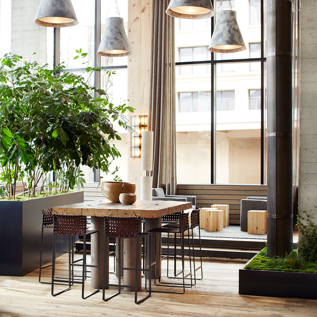 The interiors make good on the hotel’s low-impact promise. The majority of the materials are reclaimed or reused, including wood salvaged from the Coney Island boardwalk and Williamsburg’s old Domino Sugar factory. The result isn’t just virtuous, it’s richly textured and touchable as well, lending a warmth to these old spaces that’s at odds with the severe minimalism that once ruled New York’s boutique hotels. And it’s green in ways that are harder to see: the building collects rainwater, releasing it to the park when needed, and the whole hotel runs on wind power.