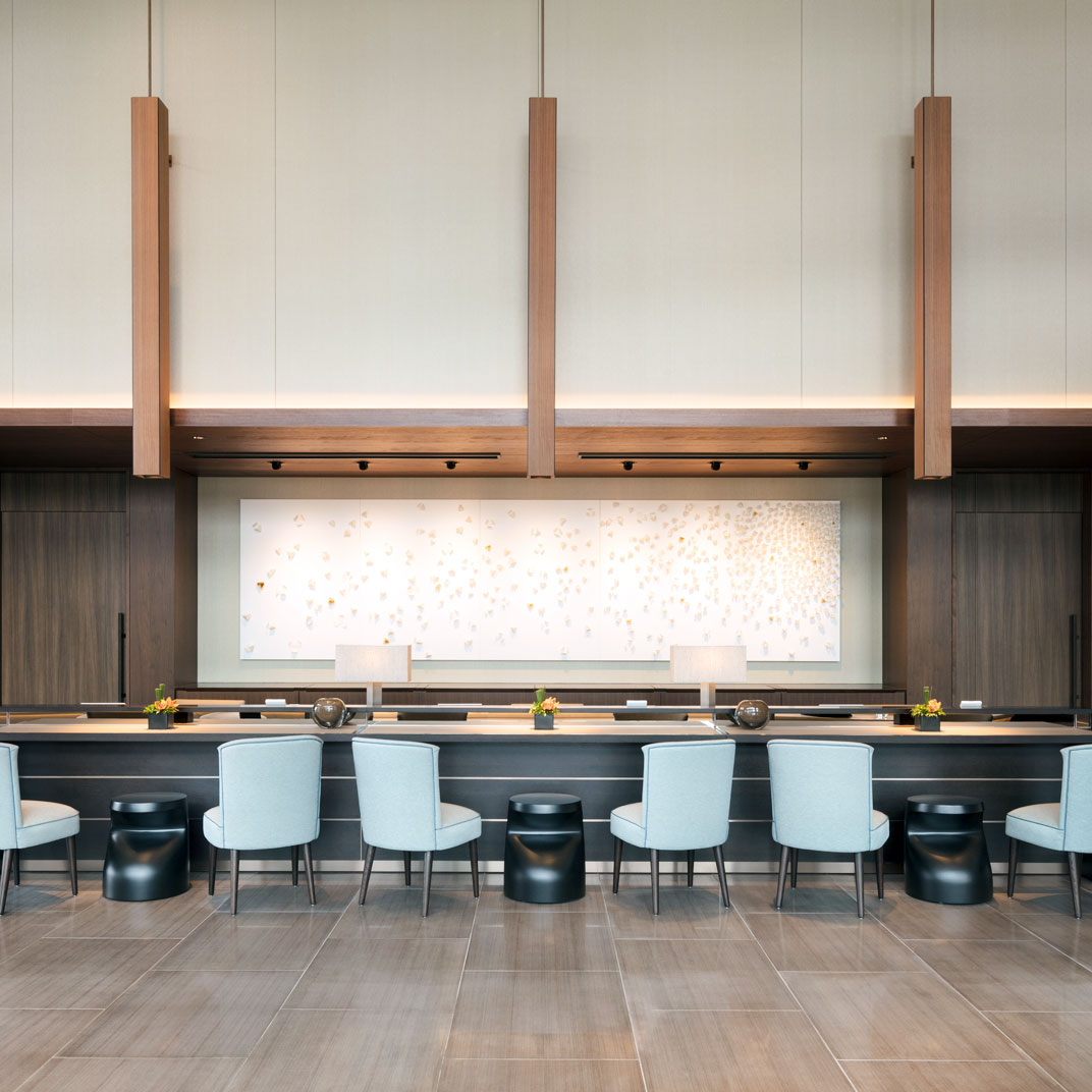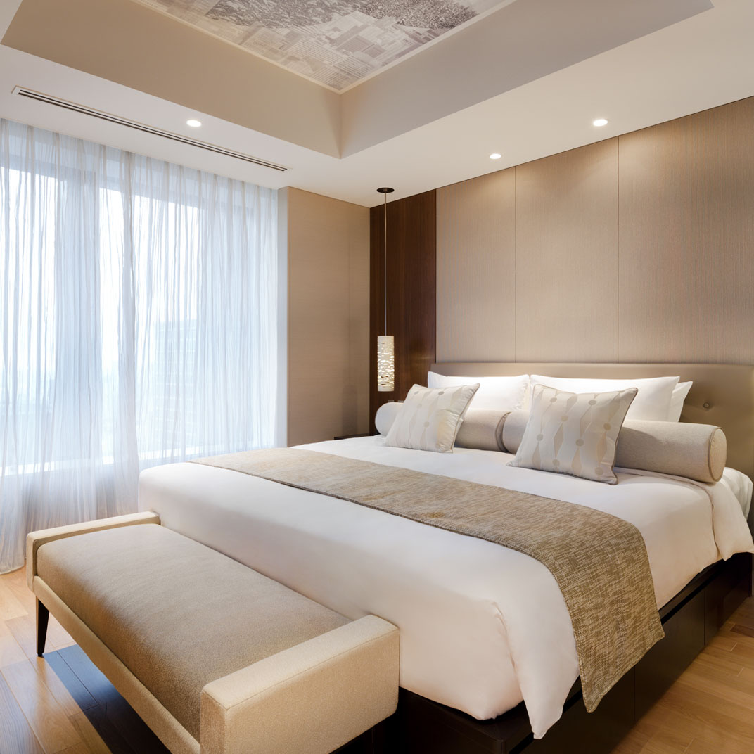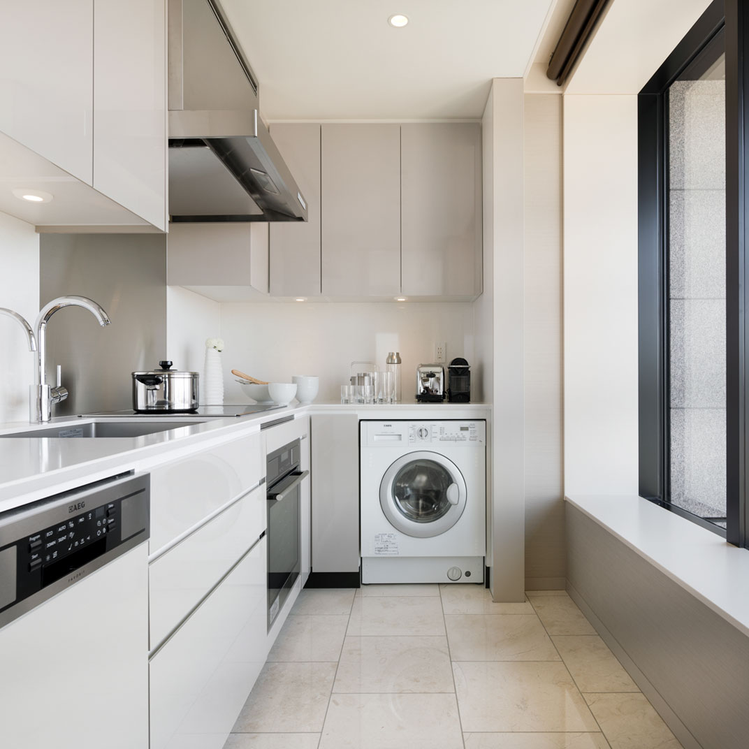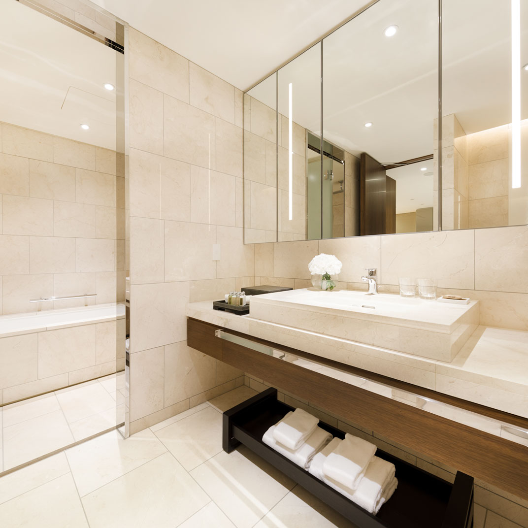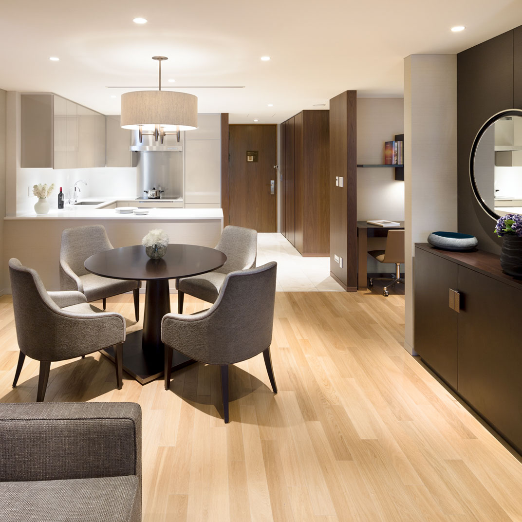 They’re more sedate, more sparsely decorated, as befits an apartment you might spend weeks in, rather than a few nights. And if they’re perhaps less lavish in an immediately dazzling way, they’re arguably more luxurious when you take into account the residential-style comforts; studio suites come with kitchenettes and cozy two-person dining tables, while the one-bedrooms add proper living rooms, and as you go up the range you come into full kitchens, dining rooms that are spacious enough for a dinner party, and eventually the three-bedroom Marunouchi Suite.