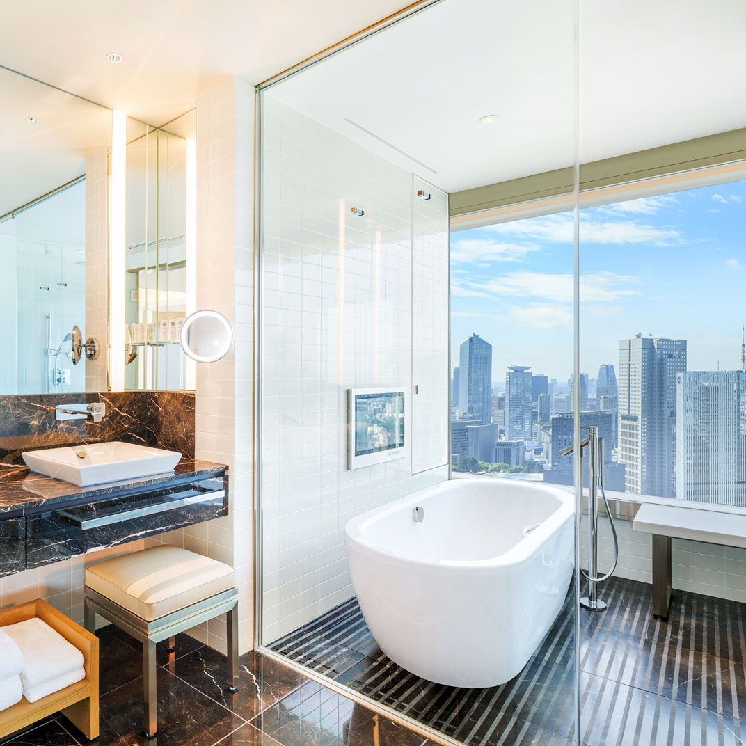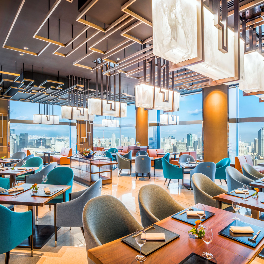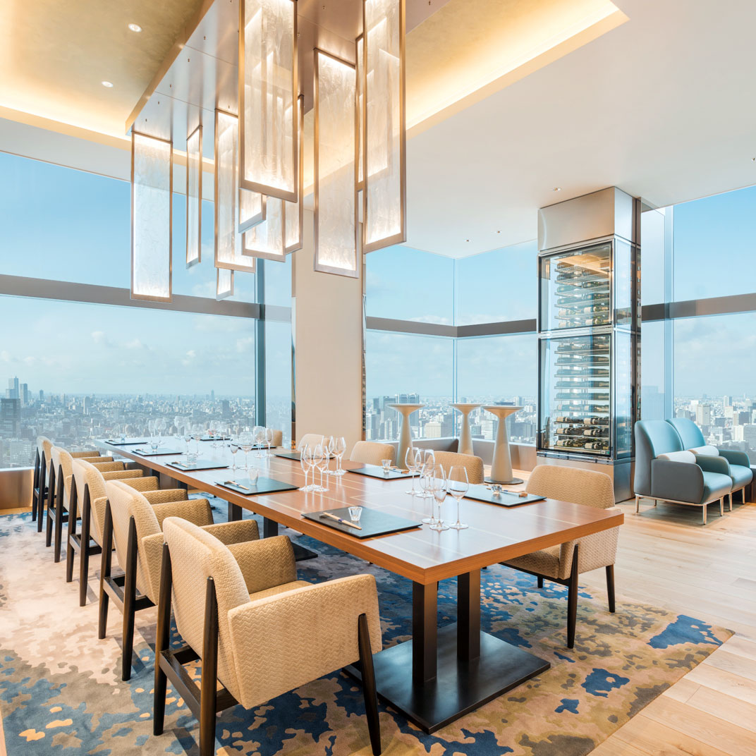 As with many hotels of this ilk, the Club Lounge is a hive of activity; visit as much for its sweeping panorama as its facilities: pool, Swiss spa, welcome drinks, shoeshines, and a full suite of business services. A trio of suitably elegant restaurants round out the experience — Washoku Souten gets our vote for its traditional Japanese cuisine and sake bar in a crystalline space with wraparound exposure — while a matching trio of bars sustain the impeccable service in ambiences ranging from candles-and-velvet to commanding views of the twinkling urban twilight. A nightscape for a nightcap.