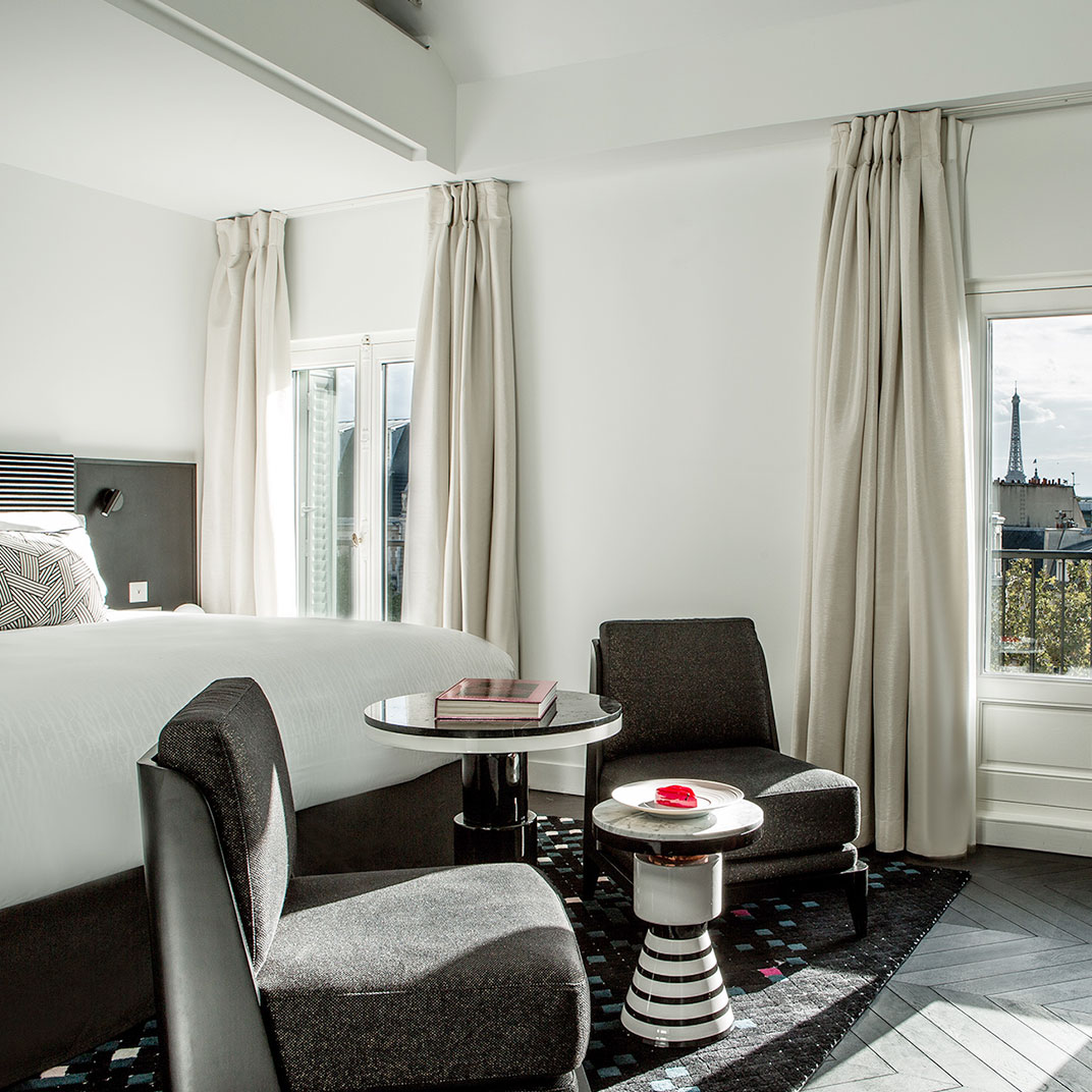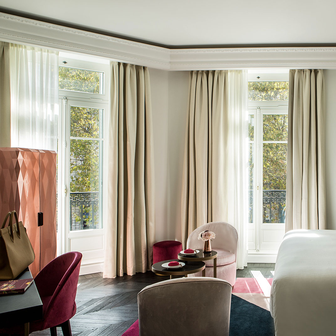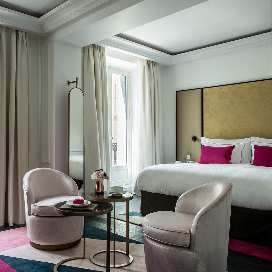 The rooms and suites are exactly what we mean when we say “contemporary classic” — they’re typically Parisian, with 19th-century architectural elements, graphic echoes of Art Deco, and custom furniture in a contemporary color palette. All the details are entirely up to date, including some impressive electronics, and Fauchon’s culinary heritage means you’re provided with a liberal assortment of sweets and small bites in your in-room mini-pantry.