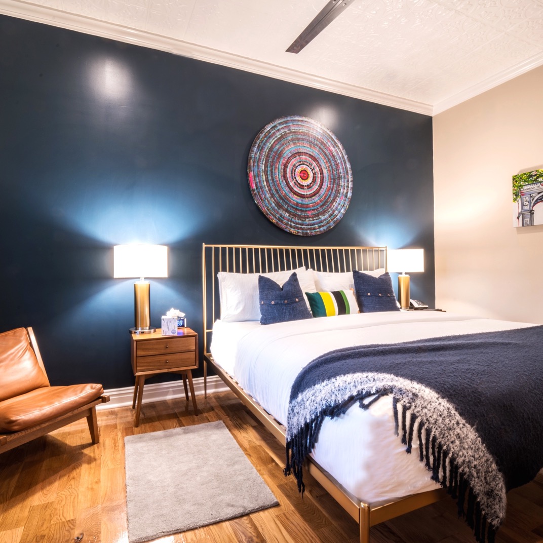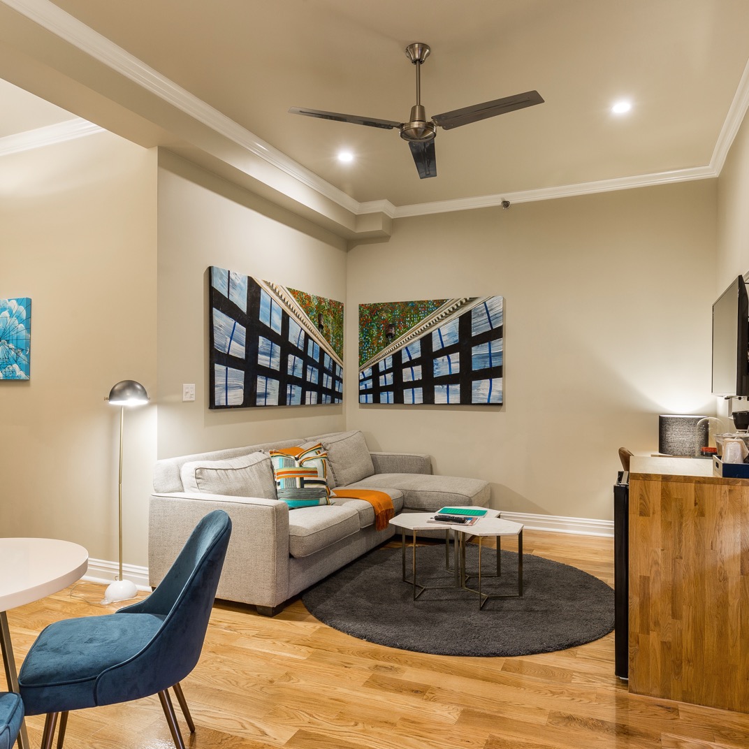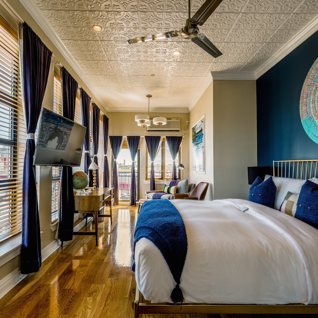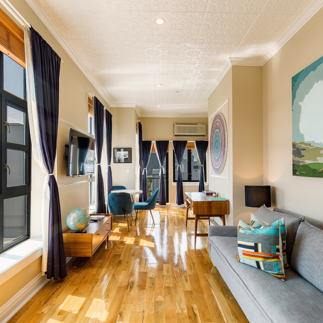From the outside, the hotel could easily be mistaken for another warehouse-turned-apartment-building in its Greenpoint neighborhood. The inside is just as true to form. The sunny, high-ceilinged rooms are fitted with large kitchenettes, dishware and all. By New York standards, they could just about pass as full kitchens, with more than enough counter space to sit on a stool and tear into some boxes of take-out. The homey urban décor, from the big pull-out sofas to the warm modern lighting and hardwood floors, all makes as much sense at this converted door factory in its low-slung, revitalized industrial neighborhood as a high-rise hotel makes sense in Midtown. Perhaps the biggest impact of the surrounding real estate, however, is on the price. Put simply, you get more for your money here.