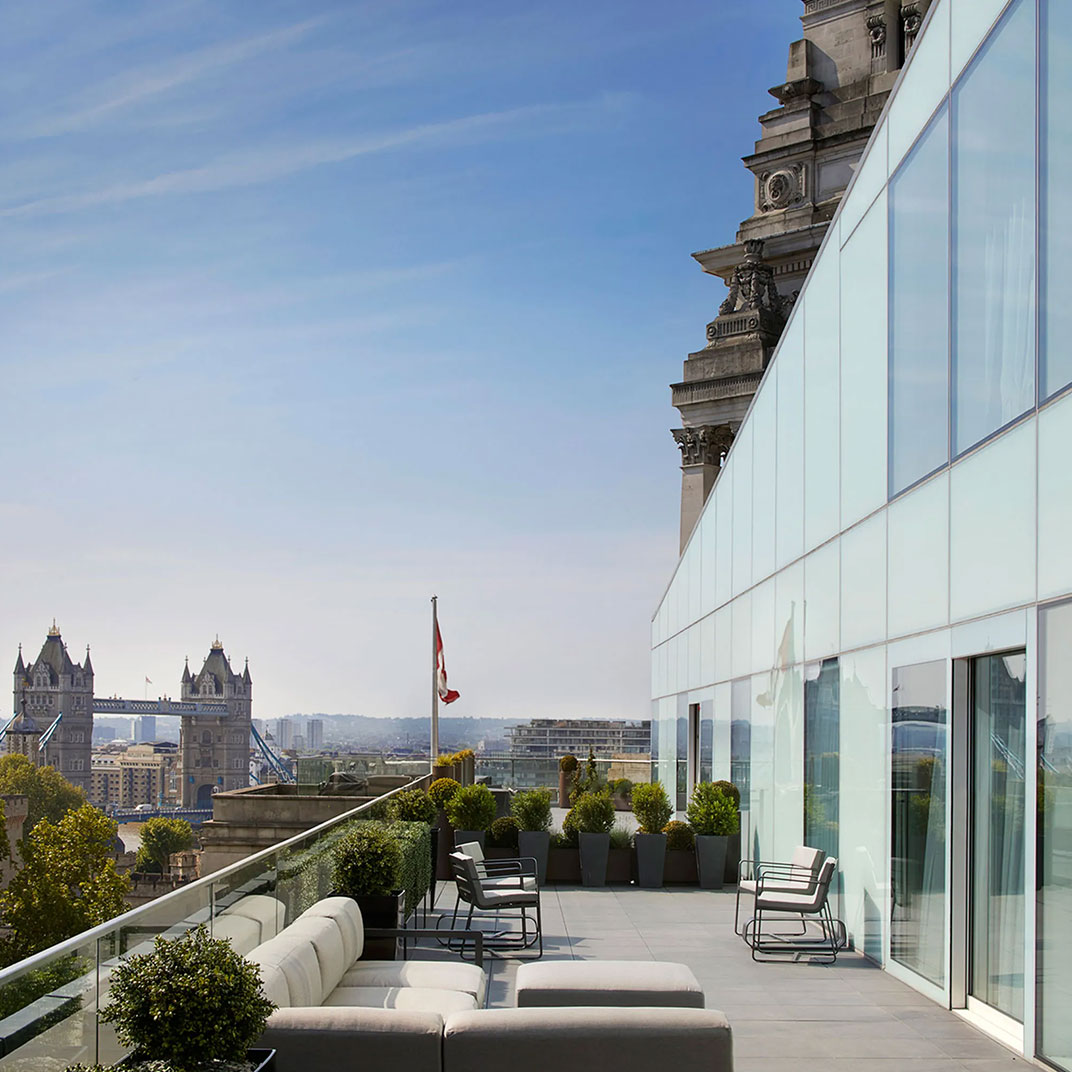 Like many luxury hotels housed in historic landmarks, the Four Seasons Hotel London at Tower Bridge exudes old-world grandeur. This stately Beaux-Arts building was once the home of the Port of London Authority, and during its 1920s heyday, more than a thousand people passed through its halls each day to pay port dues on goods arriving from China and the East Indies. Elements of the original structure remain, like towering Corinthian columns, decorative woodwork, and heavy crystal chandeliers, but it’s mostly the palatial scale that reminds you of the building’s history.