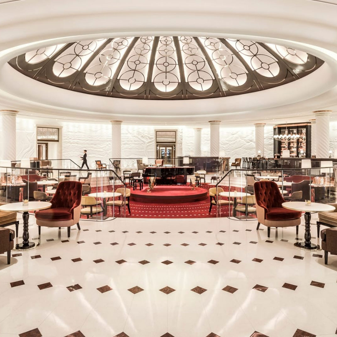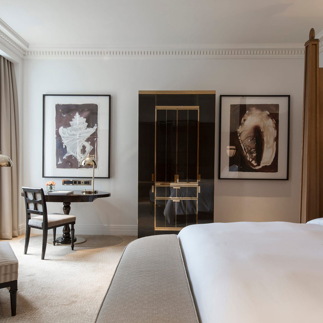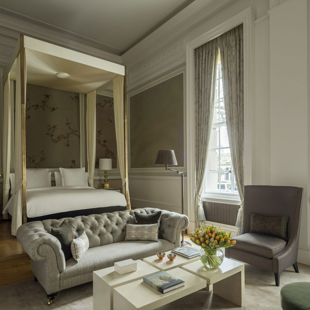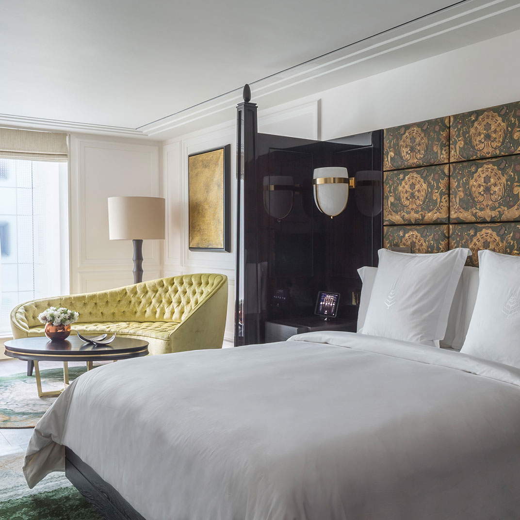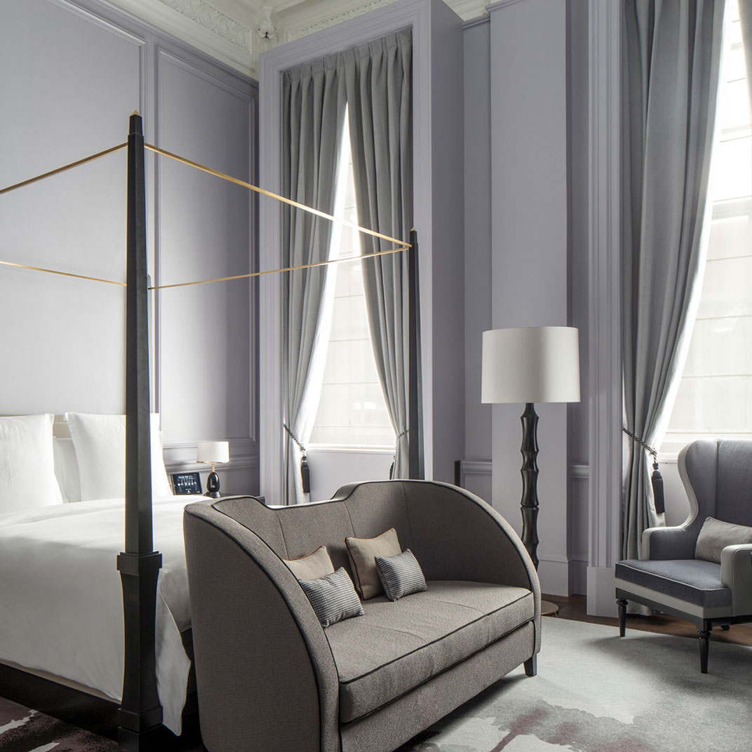 Four levels of rooms and suites are set around the lobby Rotunda with its magnificent glass-domed ceiling, a striking venue for breakfast, cocktails, and everything in between, including afternoon by London’s famed baker, Lily Vanilli. Standard rooms, designed in muted shades of blue, gray, or beige, are on the lower floors. All feature polished wood paneling, writing desks, Nespresso machines, custom king-sized beds, and lavish white marble bathrooms with heated flooring, as well as high-tech amenities like complimentary iPads and Bose sound systems. Inside the building’s former executive offices are elegant suites with extra-high ceilings, original crown molding, hardwood flooring, and chic seating areas with fireplaces and sofas; on the top floor, a small collection of apartment-like hotel residences offer private terraces, full kitchens, and multiple bedrooms.