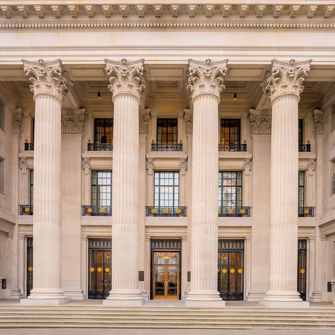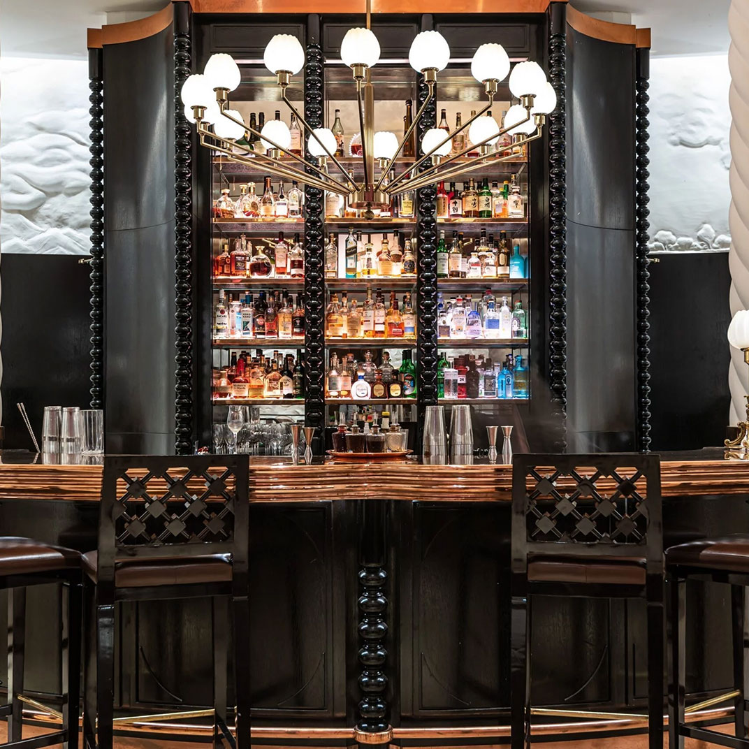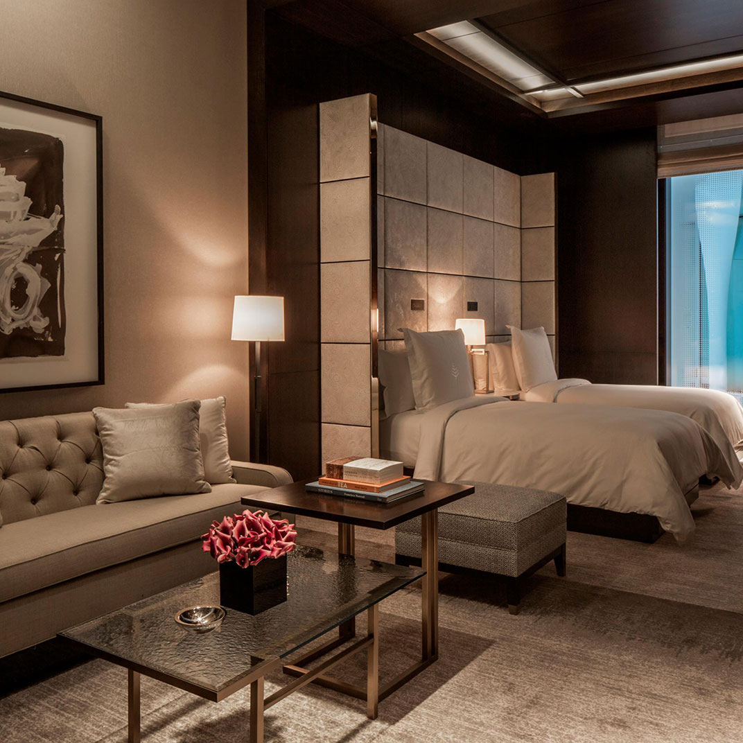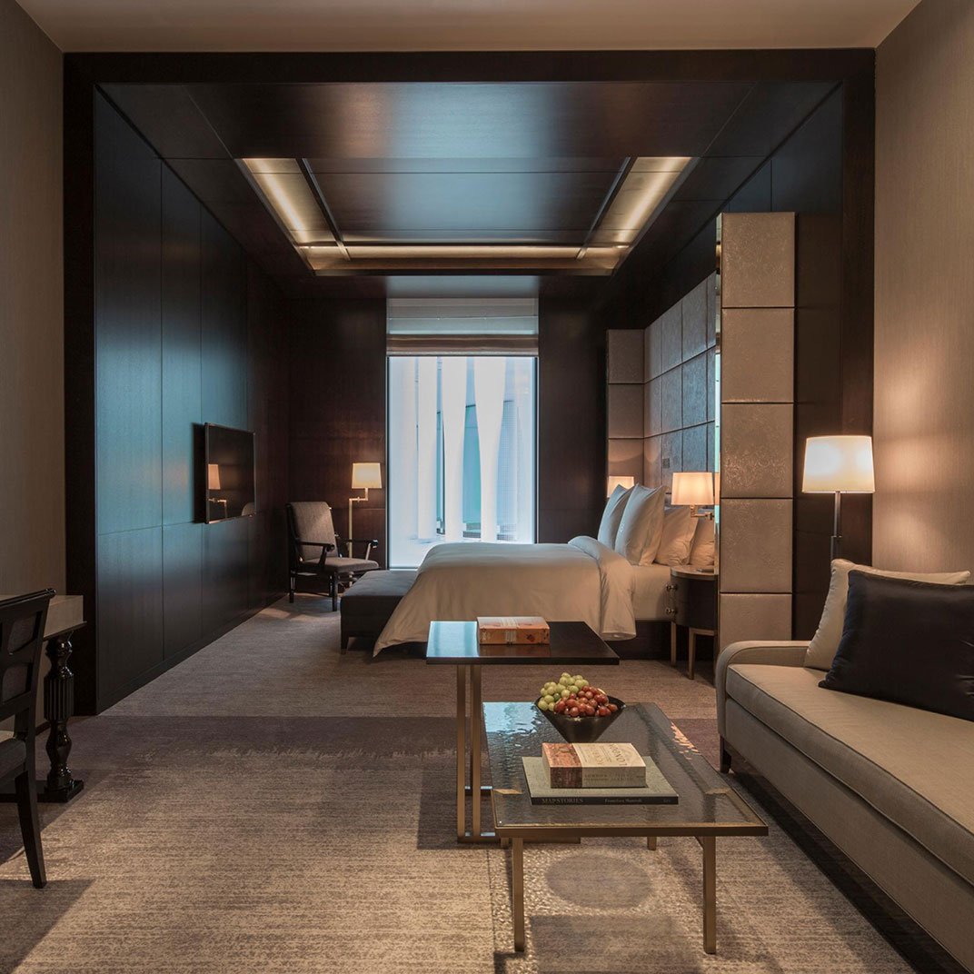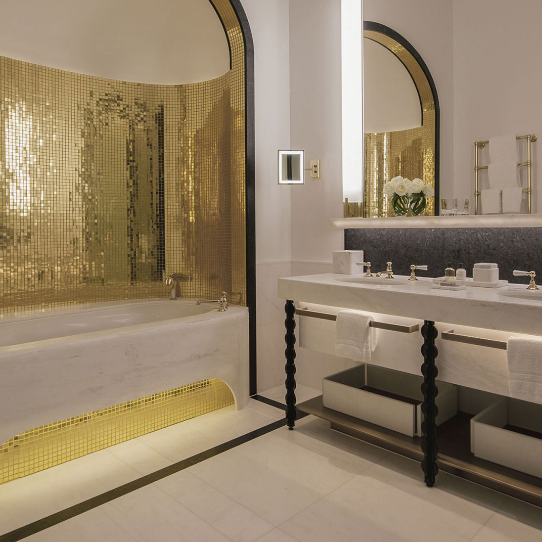 Four levels of rooms and suites are set around the lobby Rotunda with its magnificent glass-domed ceiling, a striking venue for breakfast, cocktails, and everything in between, including afternoon by London’s famed baker, Lily Vanilli. Standard rooms, designed in muted shades of blue, gray, or beige, are on the lower floors. All feature polished wood paneling, writing desks, Nespresso machines, custom king-sized beds, and lavish white marble bathrooms with heated flooring, as well as high-tech amenities like complimentary iPads and Bose sound systems. Inside the building’s former executive offices are elegant suites with extra-high ceilings, original crown molding, hardwood flooring, and chic seating areas with fireplaces and sofas; on the top floor, a small collection of apartment-like hotel residences offer private terraces, full kitchens, and multiple bedrooms.