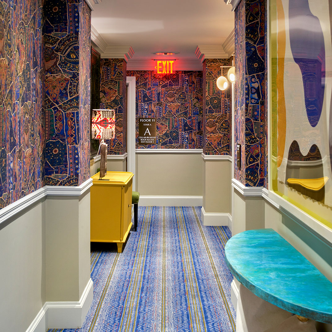 In fact the inimitable Kemp style continues to evolve. Warren Street was designed by Kit and her daughters Willow and Minnie, and the result is somehow even more packed with pattern, texture, and color than ever — in stark contrast with the minimalist styles that once defined Downtown Manhattan style. Each of its 69 rooms and suites is unique, though obviously cut from the same vast and eclectic collection of cloth. They’re as comfortable as they are visually striking, right down to the marble bathrooms and the subtly high-tech entertainment systems.