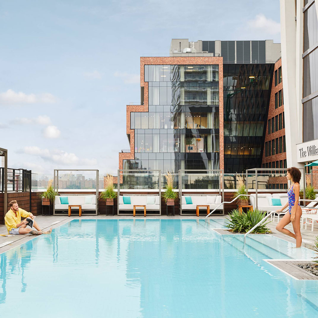 In Williamsburg, whose rare high-rise buildings tend towards the nondescript, the William Vale is an immediate eye-catcher. The building, by Albo Liberis, is unmistakable, and with an exterior like that, you expect big things from what’s inside. And, in what has to be considered a leap forward for the Brooklyn hotel scene, the William Vale delivers — Williamsburg’s finally got the modern-luxe boutique hotel it was always destined to have.