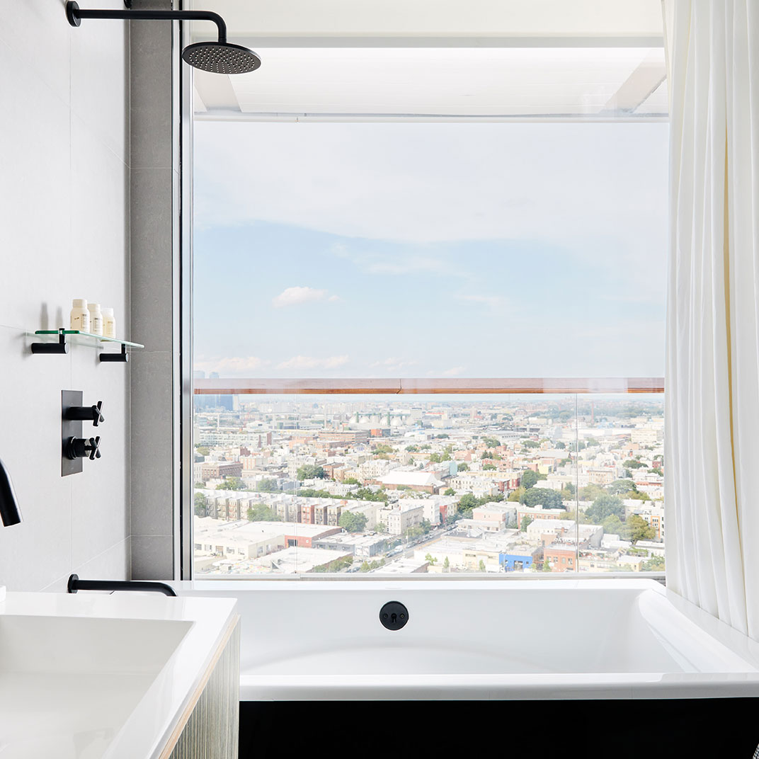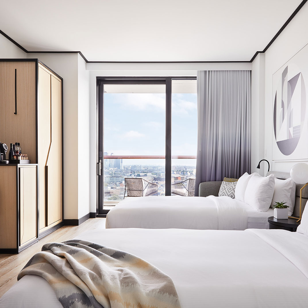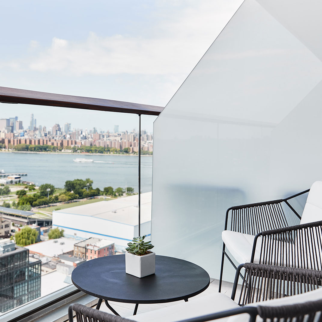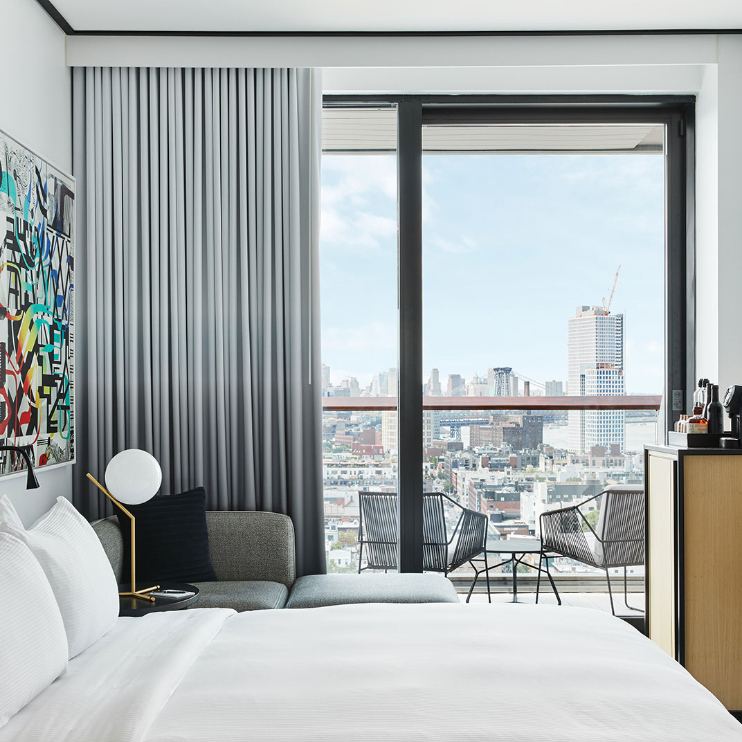 Towering as it does 22 floors above North 12th Street, the William Vale is all about the views. Floor-to-ceiling windows are universal, as are balconies, and the rooms’ monochrome backdrop and colorful accents make the most of the plentiful sunlight. Queen rooms are by no means small, suites are downright spacious, and the addition of usable outdoor space is a rare luxury for New York.