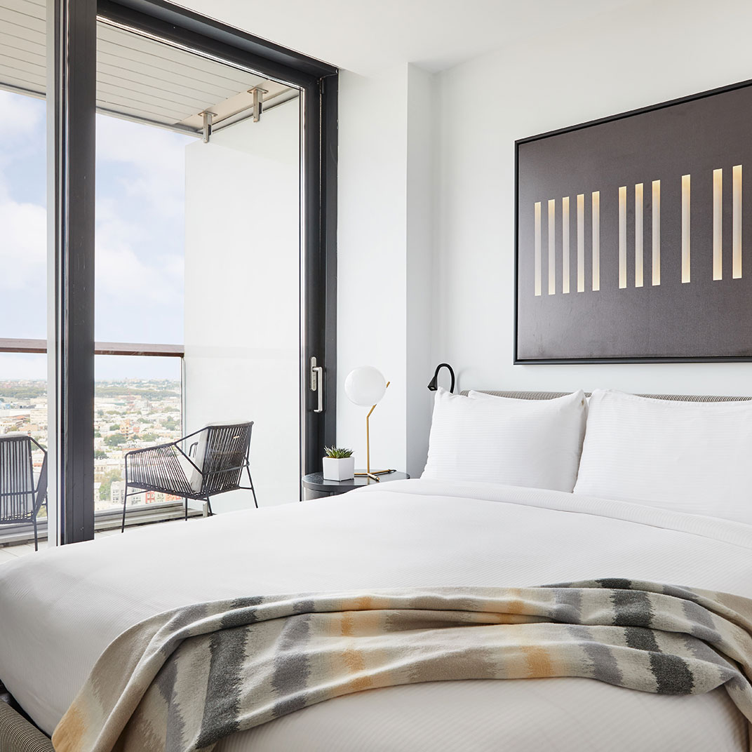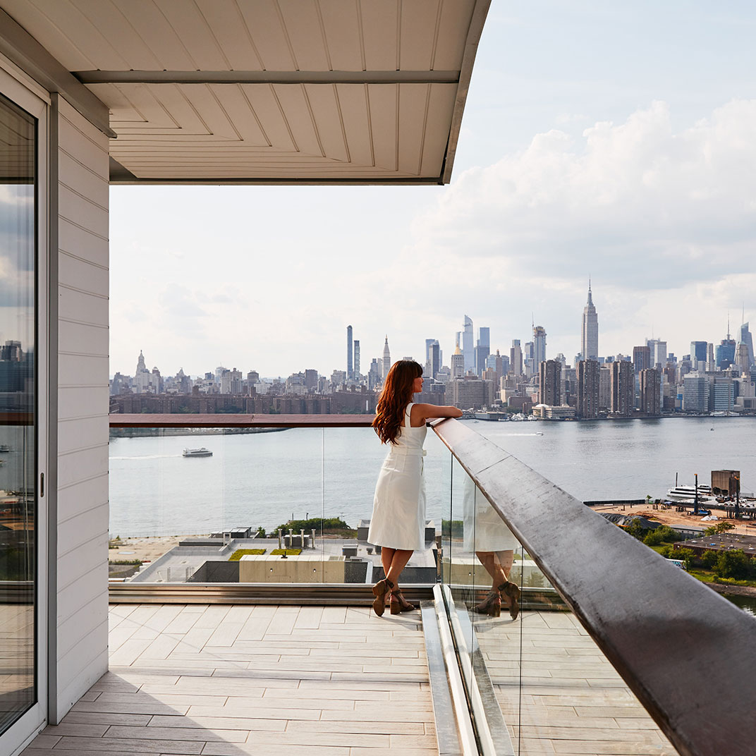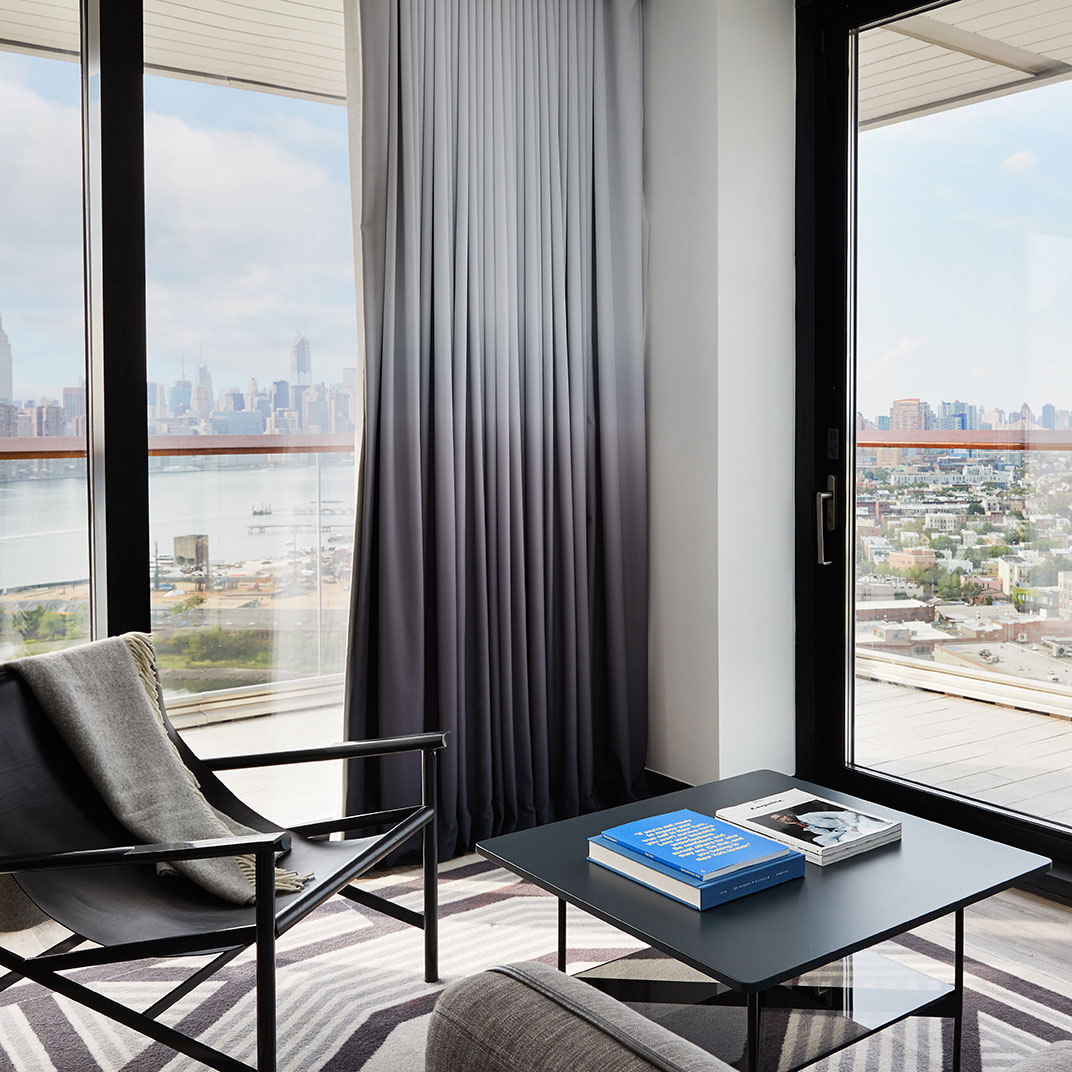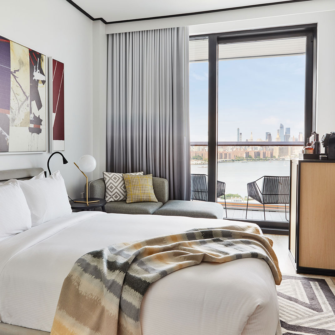 Towering as it does 22 floors above North 12th Street, the William Vale is all about the views. Floor-to-ceiling windows are universal, as are balconies, and the rooms’ monochrome backdrop and colorful accents make the most of the plentiful sunlight. Queen rooms are by no means small, suites are downright spacious, and the addition of usable outdoor space is a rare luxury for New York.