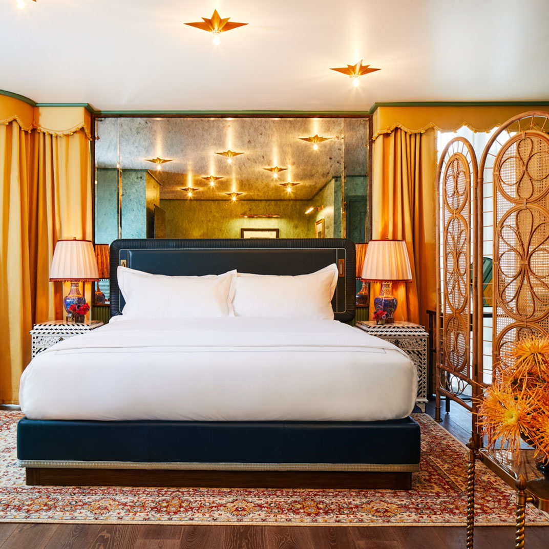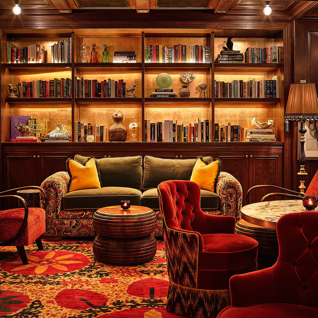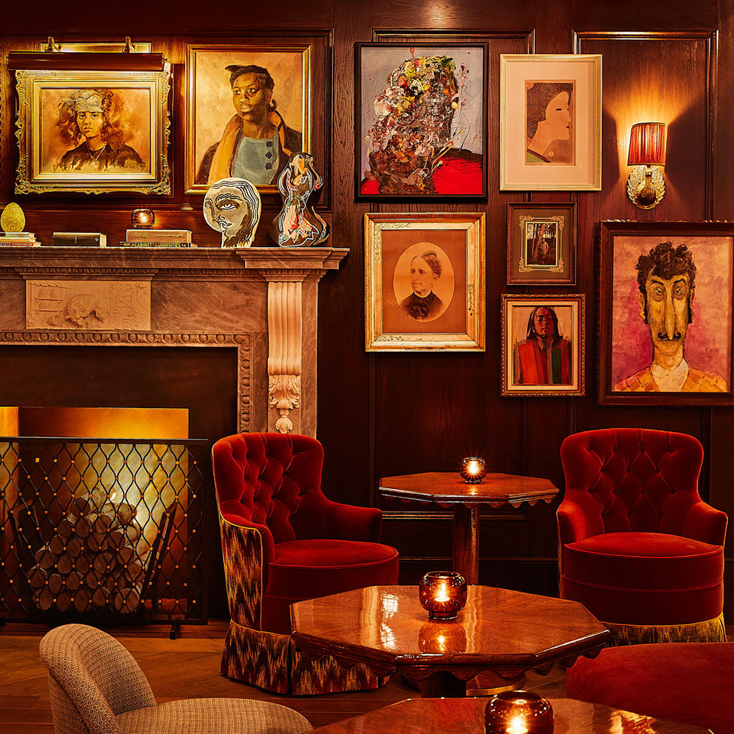 Downstairs you’ll find social spaces that are as dazzling as the rooms, or more. The Portrait Bar is a contemporary riff on a classic drawing room, complete with wood-paneled walls, a carved stone fireplace, and an eclectic, era-spanning collection of artworks, as well as an inventive menu by Darryl Chan. And the restaurant, Café Carmellini, is the work of the James Beard Award–winning chef Andrew Carmellini, best known for TriBeCa’s famous Locanda Verde.