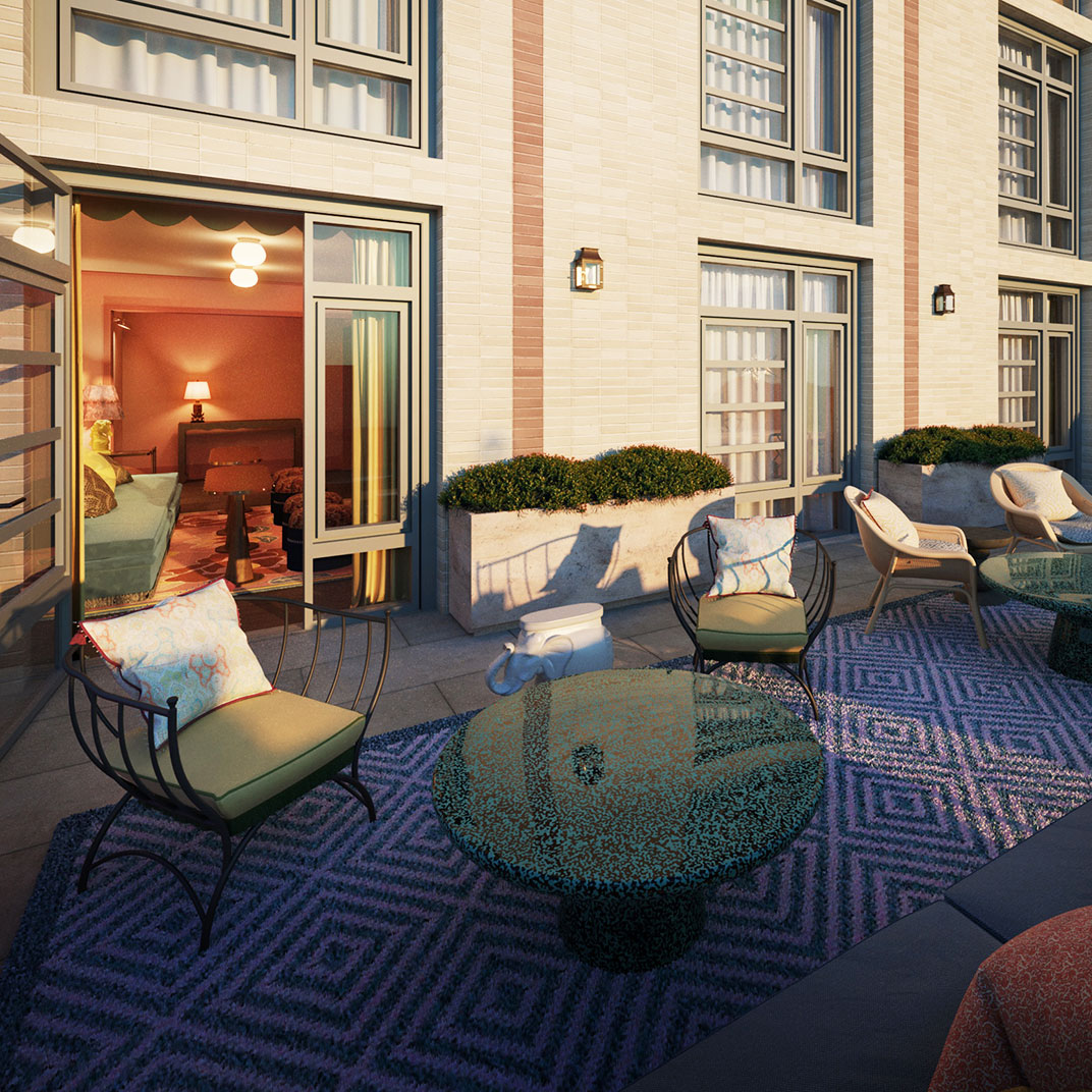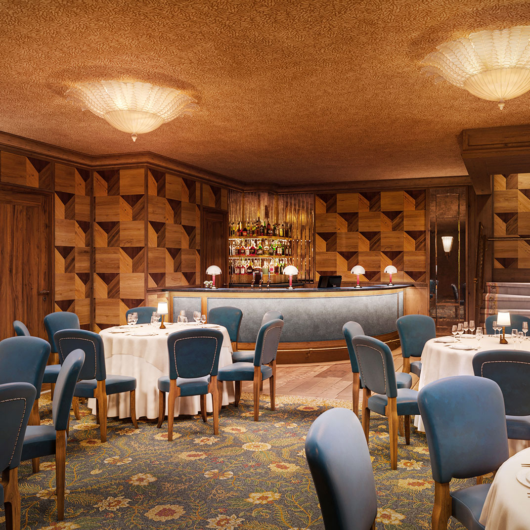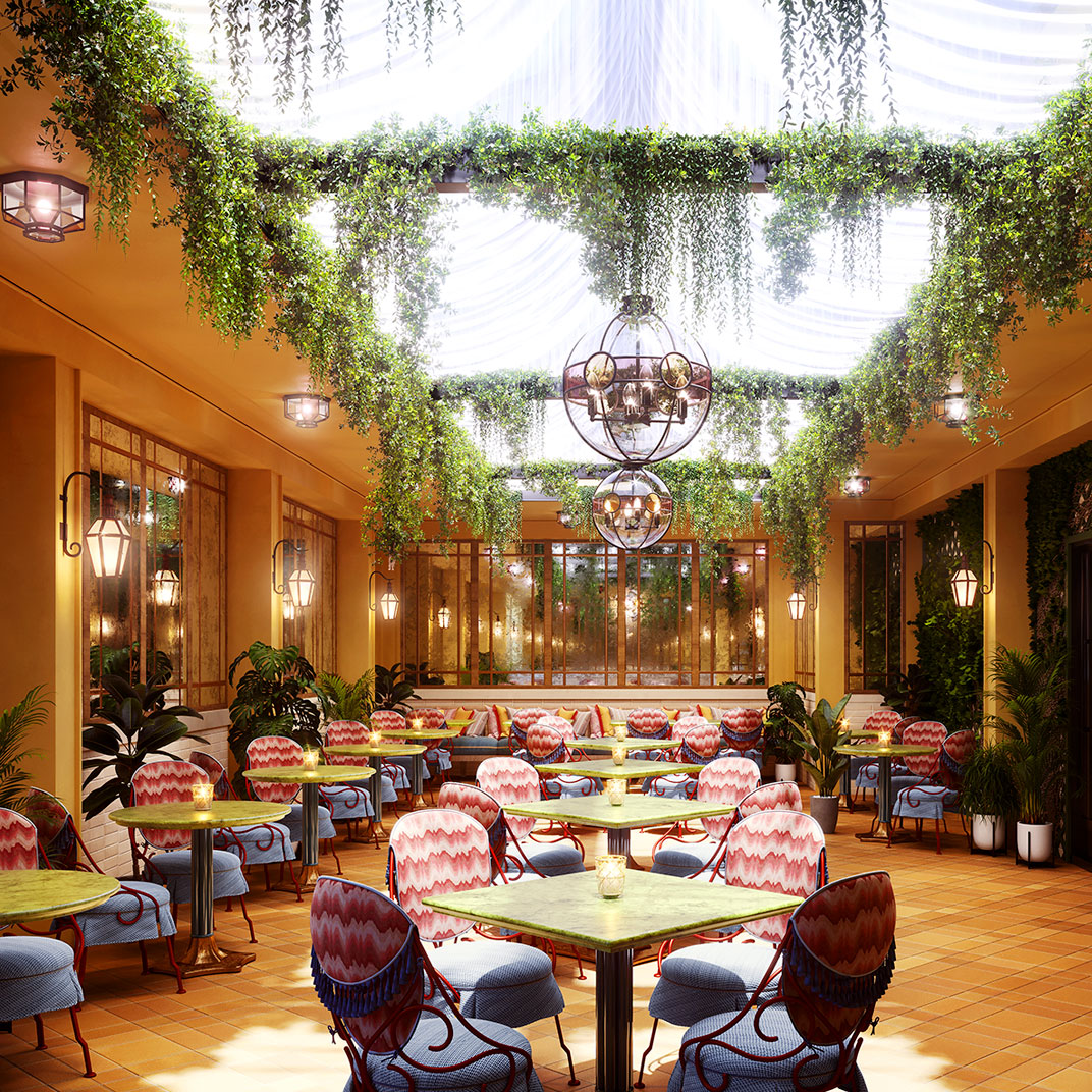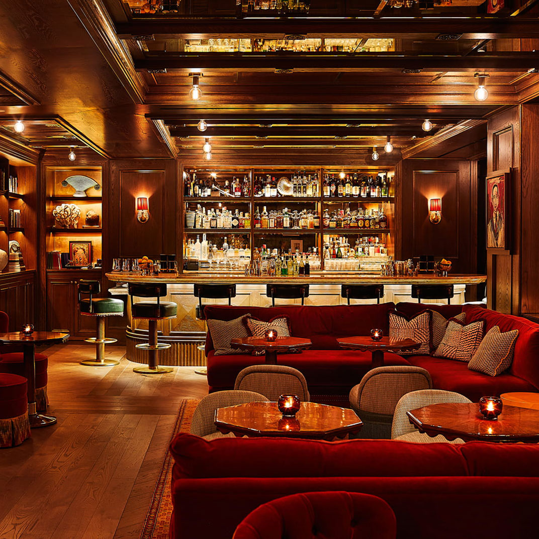 Downstairs you’ll find social spaces that are as dazzling as the rooms, or more. The Portrait Bar is a contemporary riff on a classic drawing room, complete with wood-paneled walls, a carved stone fireplace, and an eclectic, era-spanning collection of artworks, as well as an inventive menu by Darryl Chan. And the restaurant, Café Carmellini, is the work of the James Beard Award–winning chef Andrew Carmellini, best known for TriBeCa’s famous Locanda Verde.
